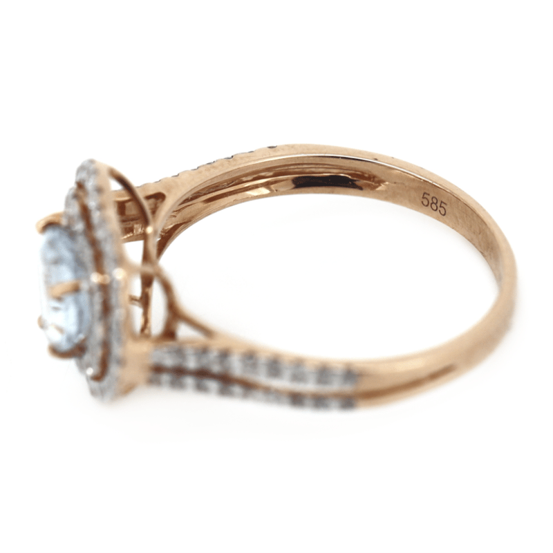 14K ROSE GOLD, AQUAMARINE AND DIAMOND, HEART SHAPED DOUBLE HALO RING.
