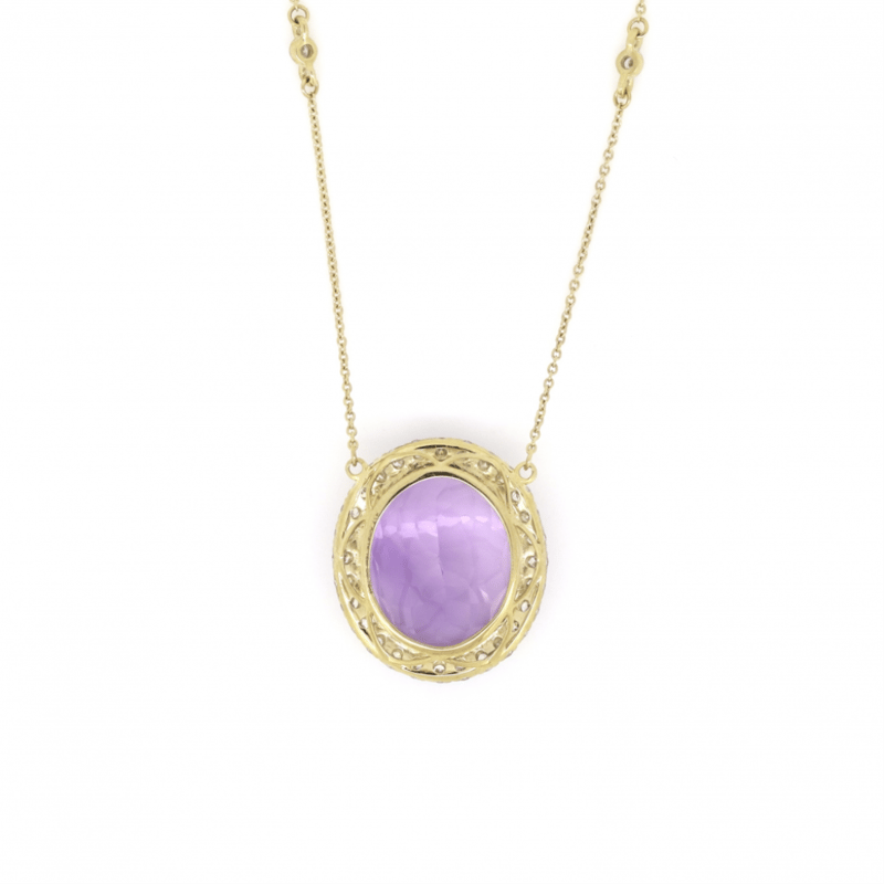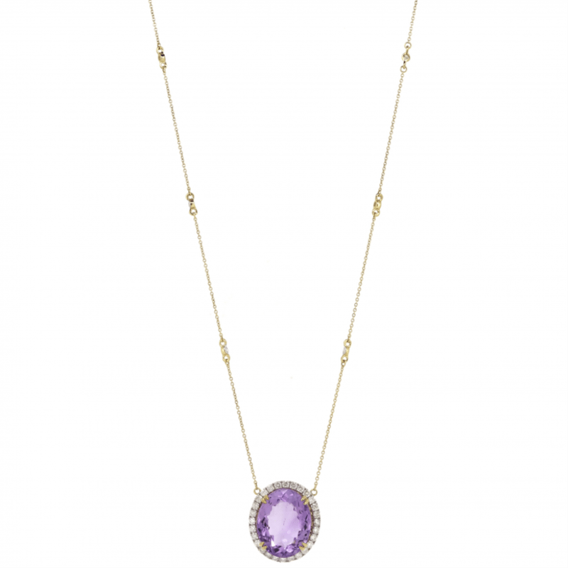 The Pendant Features, One Oval Cut, Reddish-Purple, Amethyst (14.16Ct, Minor Eye Visible Inclusions), Double Claw Set. Surrounding The Stone In A Halo And Decorating The Chain Are, 34 Round Brilliant Cut, Diamonds (0.79Ct Tdw, J-K Colour, Si2-I2 Clarity), Claw Set In White Gold. The Necklace Has A Lobster Claw Clasp. Chain Length Is 49Cm.
