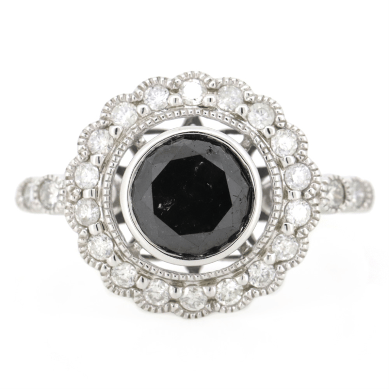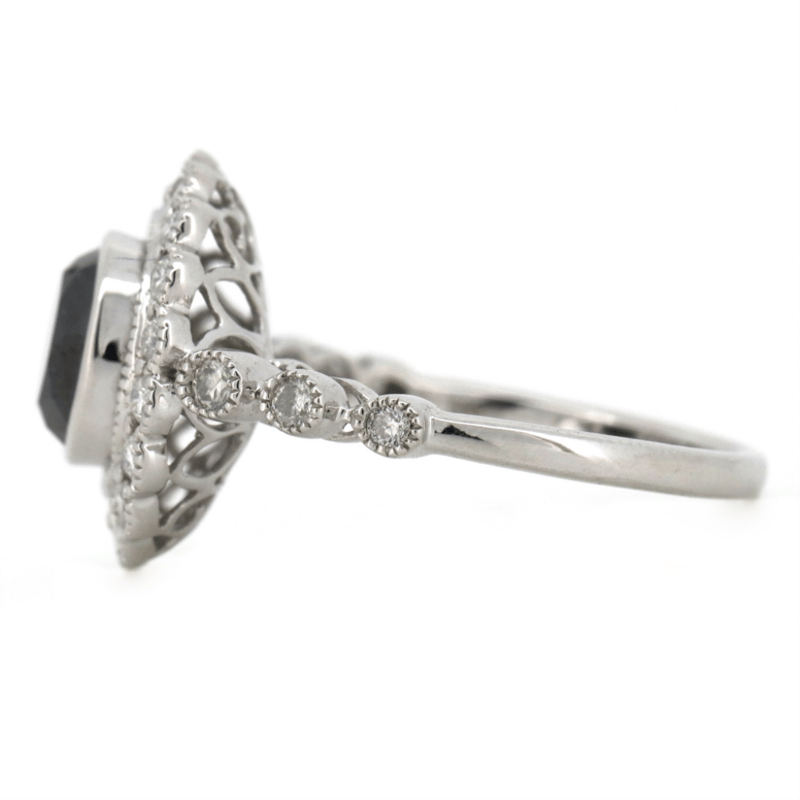 14K WHITE GOLD, BLACK DIAMOND AND DIAMOND, ANTIQUE INSPIRED HALO RING.