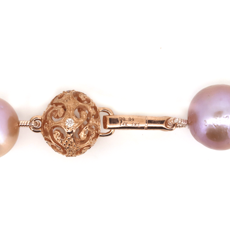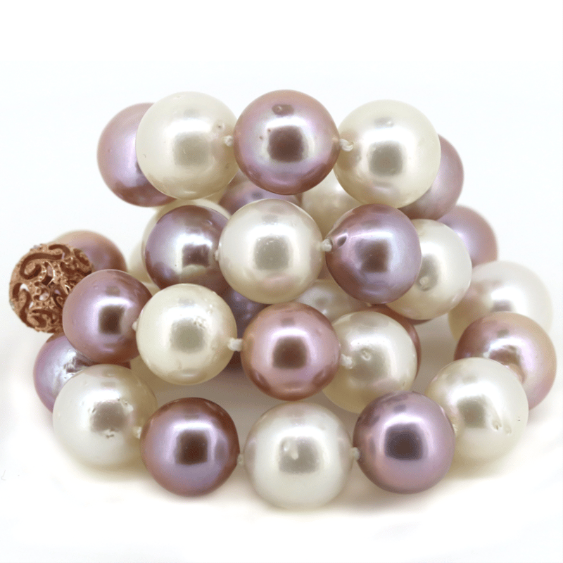 14K ROSE GOLD, WHITE CULTURED SOUTH SEA PEARL, PINK CULTURED FRESHWATER PEARL AND DIAMOND, STRAND NECKLACE.