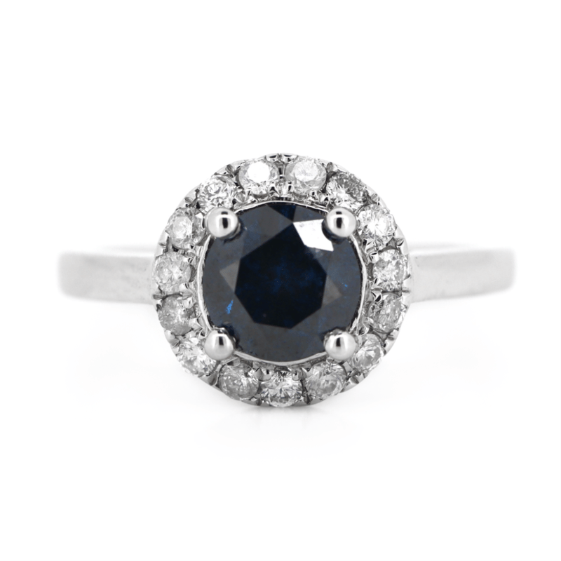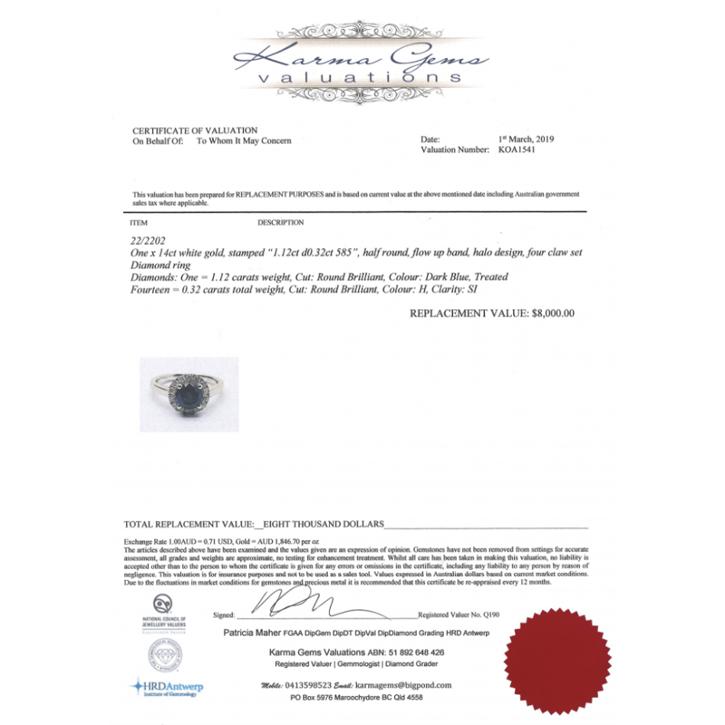 The Centre Features, One Round Brilliant Cut, Dark Blue, Diamond (1.12Ct, Enhanced), 4 Claw Set. Surrounding The Centre In Halo Are, 14 Round Brilliant Cut, Diamonds (0.32Ct Tdw, H Colour, Si Clarity), Claw Set. Ring Size L 1/2.