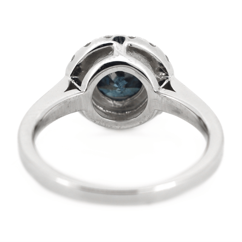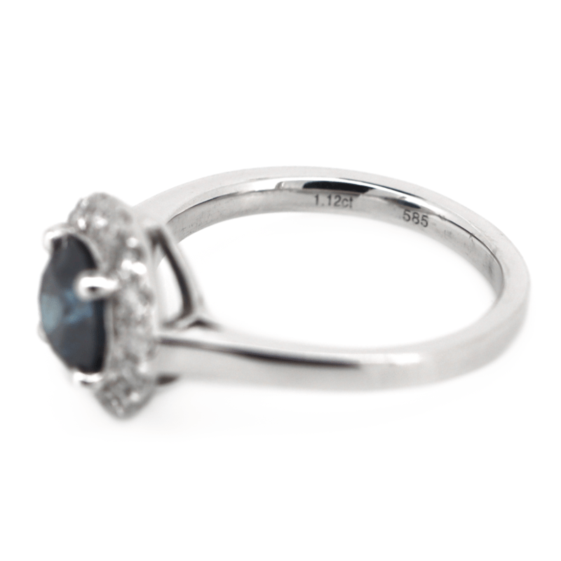 14K WHITE GOLD, BLUE DIAMOND AND DIAMOND, HALO RING.