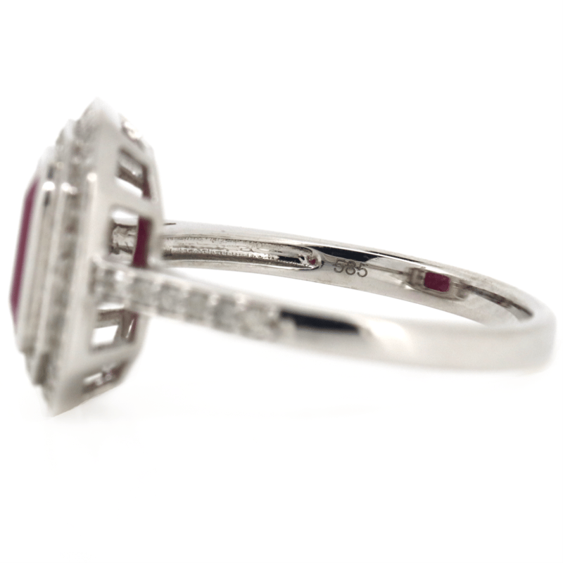 14K WHITE GOLD, RUBY AND DIAMOND, DOUBLE HALO RING.