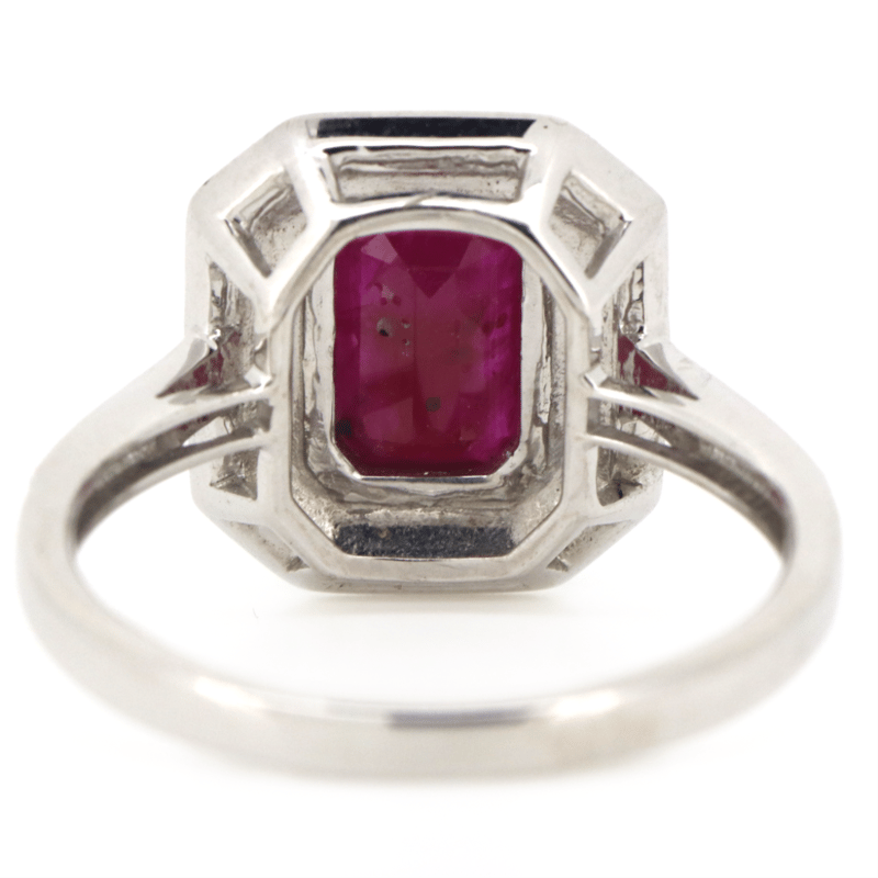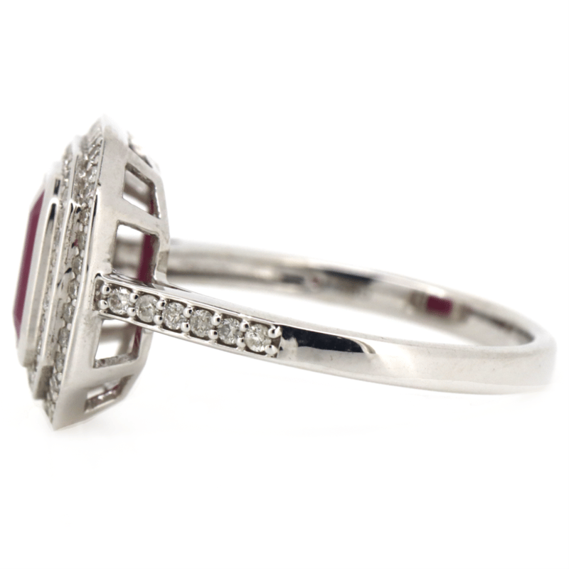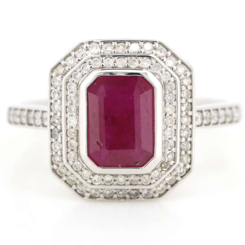 The Centre Features, One Emerald Cut, Deep Pinkish-Red, Ruby (1.55Ct, Included), Bezel Set. Surrounding The Centre In A Double Halo And Decorating The Band Are, 80 Round Brilliant Cut, Diamonds (0.35Ct Tdw, I-J Colour, Si2-P2 Clarity), Claw Set. Ring Size O 1/2.