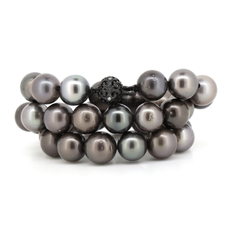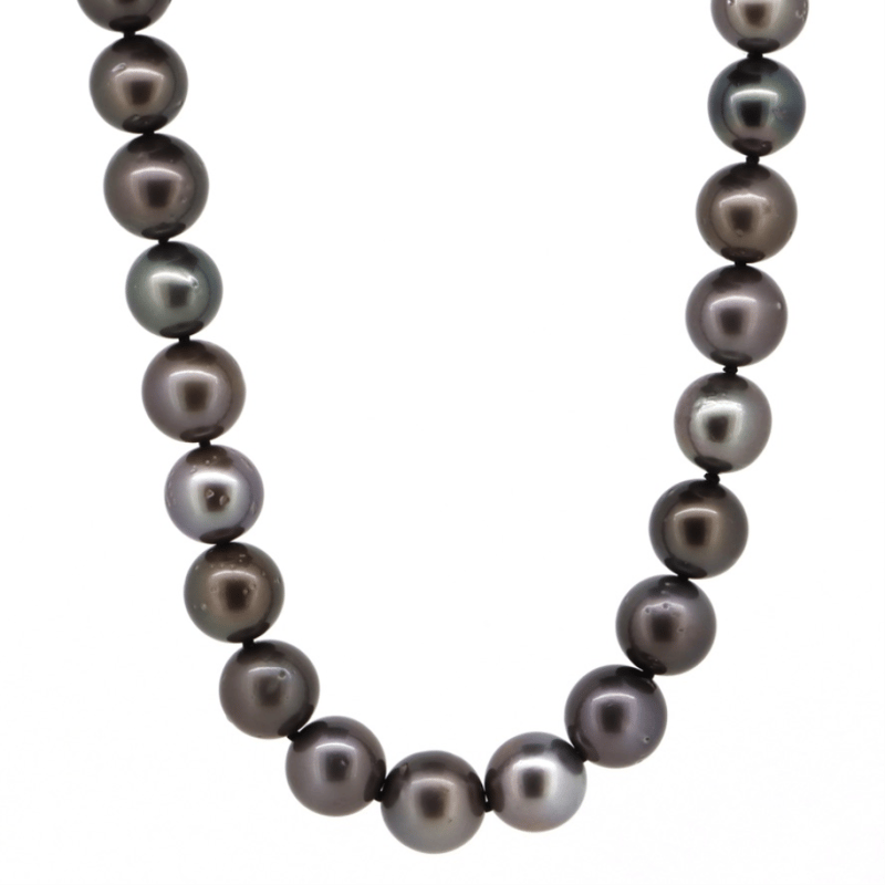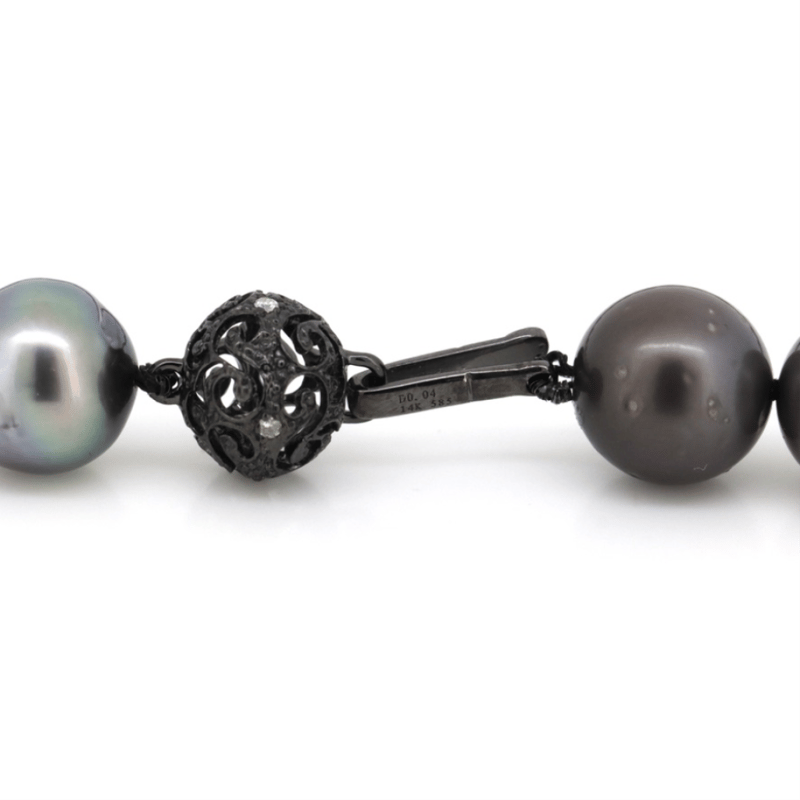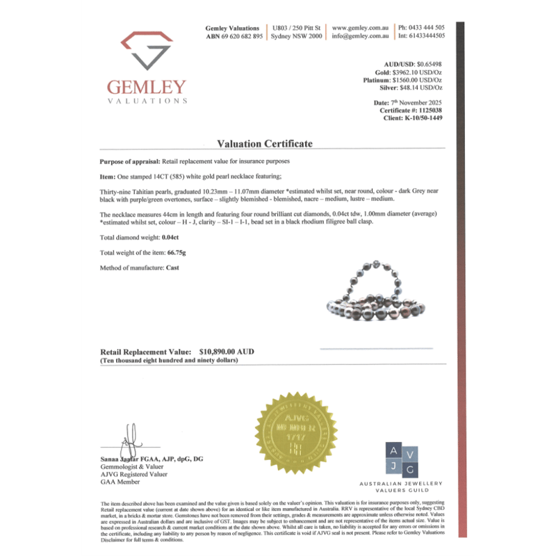 14K WHITE GOLD, BLACK CULTURED TAHITIAN PEARL AND DIAMOND, STRAND NECKLACE. The Design Features, 39 Near Round, Dark Grey With Black Green/Purple Overtones, Cultured Tahitian Pearls (10.23Mm-11.07Mm Size, Medium Lustre, Slightly Blemishes). Embellishing The 14K White Gold (Black Rhodium Plated), Filigree Ball Clasp Are, 4 Round Brilliant Cut, Diamonds (0.04Ct Tdw, H-J Colour, Si1-I1 Clarity), Bead Set. Length Is 44Cm. Valuations Provided by an Independent Third-Party Professional Not Directly Associated With Lloyds Auctions at AUD $$10,890.00This valuation has been conducted by an independent third-party professional. The valuation amount is an assessment by the issuing valuer and does not reflect the auction value of the item. Any inquiries regarding the valuation should be directed to the issuing valuer (refer to contact details on the certificate), as Lloyds Auctions has no affiliation or influence over the valuation, the valuer, or the stated amount. Condition: Good - Refer Images 0645965+1509