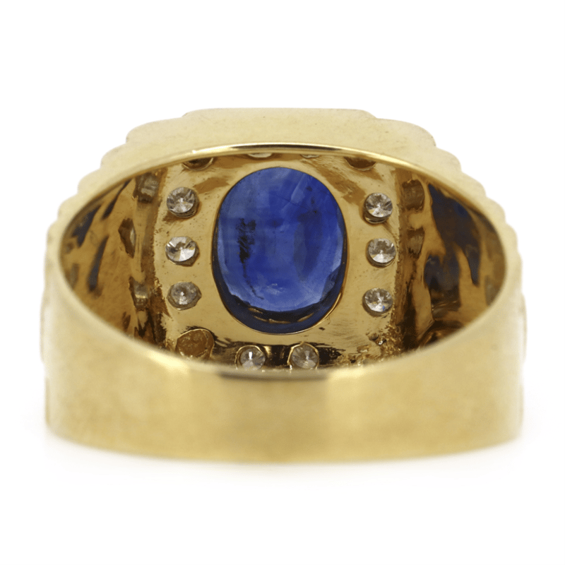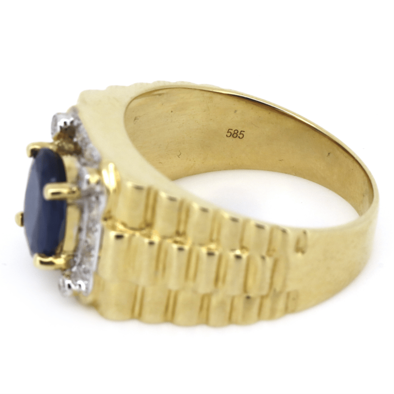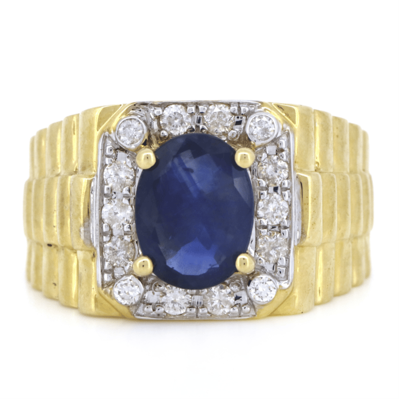 14K YELLOW/WHITE GOLD, BLUE SAPPHIRE AND DIAMOND, GENTS RING.