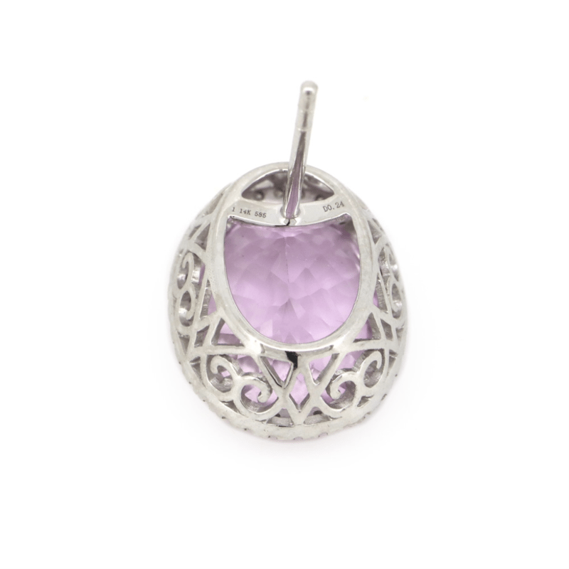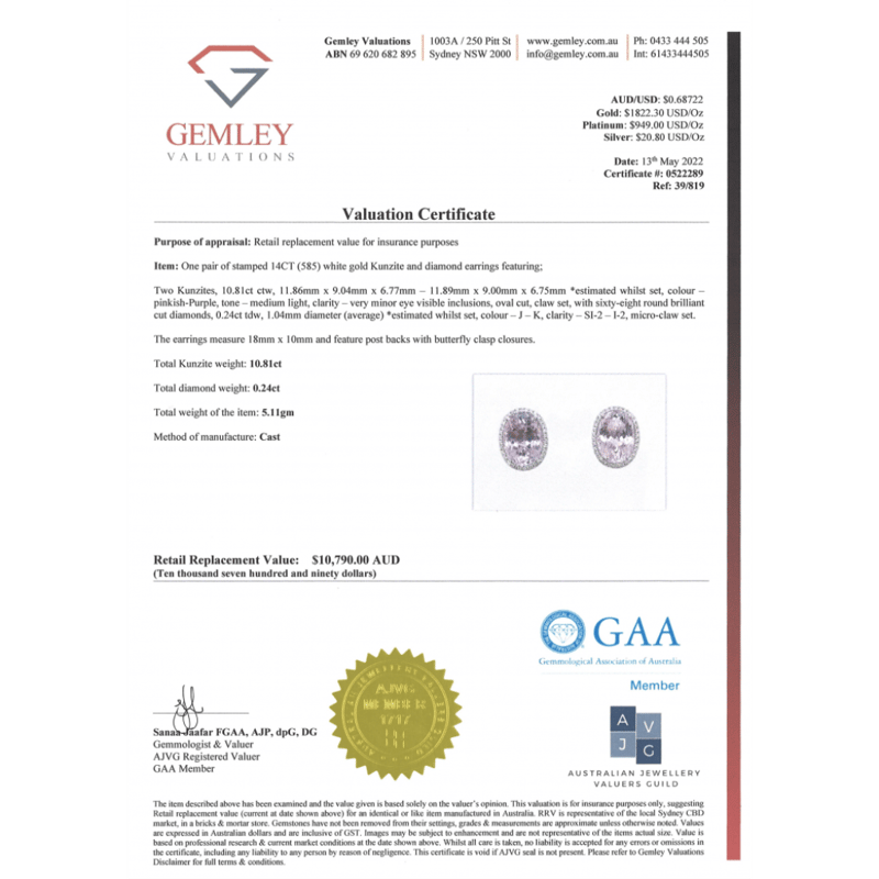 14K WHITE GOLD, KUNZITE AND DIAMOND, HALO STUD EARRINGS. The Centres Feature, 2 Oval Cut, Pinkish-Purple, Kunzites (10.81Ct Tsw, Very Minor Eye Visible Inclusions), 4 Claw Set. Surrounding The Centres In Halos Are, 68 Round Brilliant Cut, Diamonds (0.24Ct Tdw, J-K Colour, Si2-I2 Clarity), Micro-Claw Set. The Earrings Have Post Backs, With 14K White Gold Butterfly Clasps. Valuations Provided by an Independent Third-Party Professional Not Directly Associated With Lloyds Auctions at AUD $$10,790.00This valuation has been conducted by an independent third-party professional. The valuation amount is an assessment by the issuing valuer and does not reflect the auction value of the item. Any inquiries regarding the valuation should be directed to the issuing valuer (refer to contact details on the certificate), as Lloyds Auctions has no affiliation or influence over the valuation, the valuer, or the stated amount. Condition: Good - Refer Images 0645965+1524
