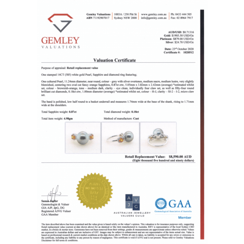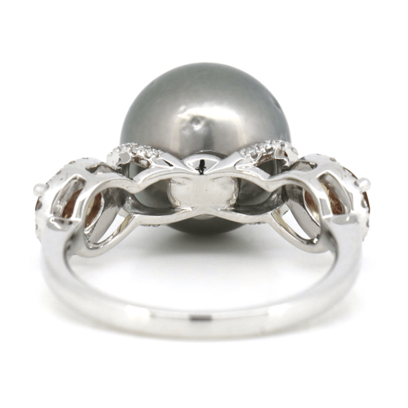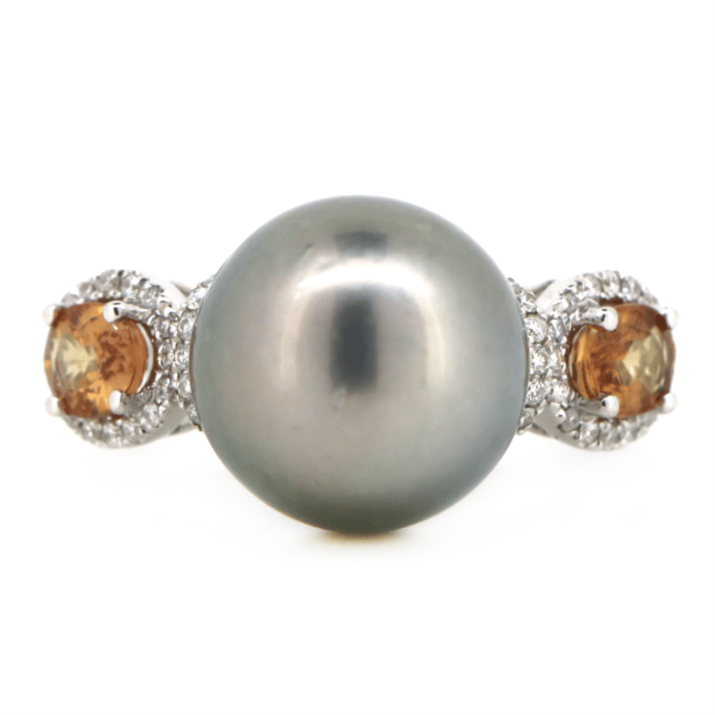 The Centre Features, One Near Round, Grey With Silver Overtones, Cultured Tahitian Pearl (11.24Mm Size, Medium Lustre, Very Slightly Blemished). Either Side Of The Centre Are, 2 Oval Cut, Fancy Brownish-Orange, Sapphires (0.87Ct Tsw, Eye Clean Clarity), 4 Claw Set. Surrounding The Sapphires In Halos And Decorating The Centre Are, 54 Round Brilliant Cut, Diamonds (0.18Ct Tdw, H-J Colour, Si2-I2 Clarity), Micro-Claw Set. Ring Size M.