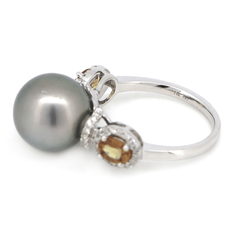 14K WHITE GOLD, GREY CULTURED TAHITIAN PEARL, ORANGE SAPPHIRE AND DIAMOND, DRESS RING.