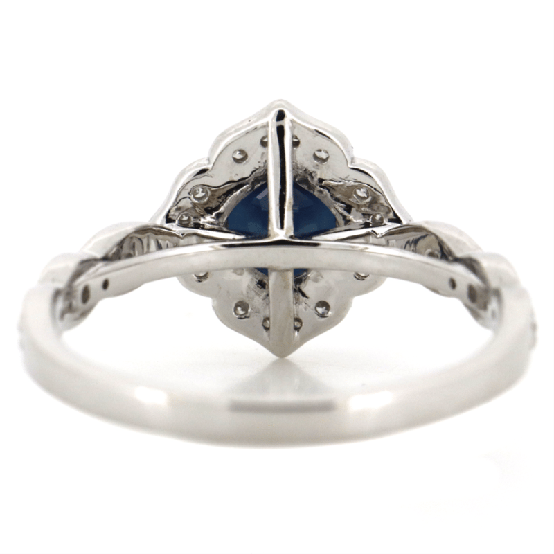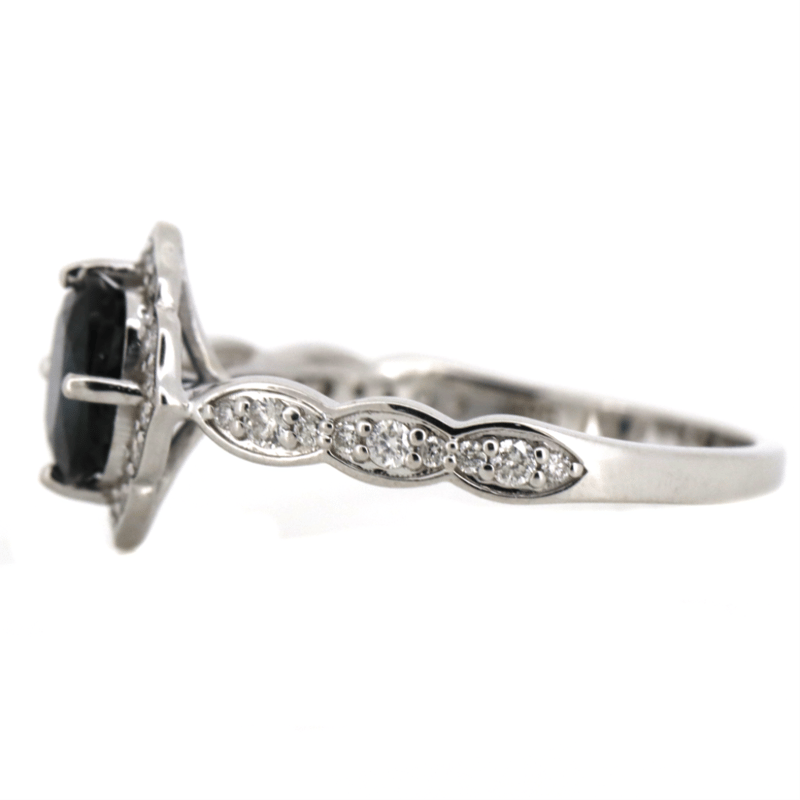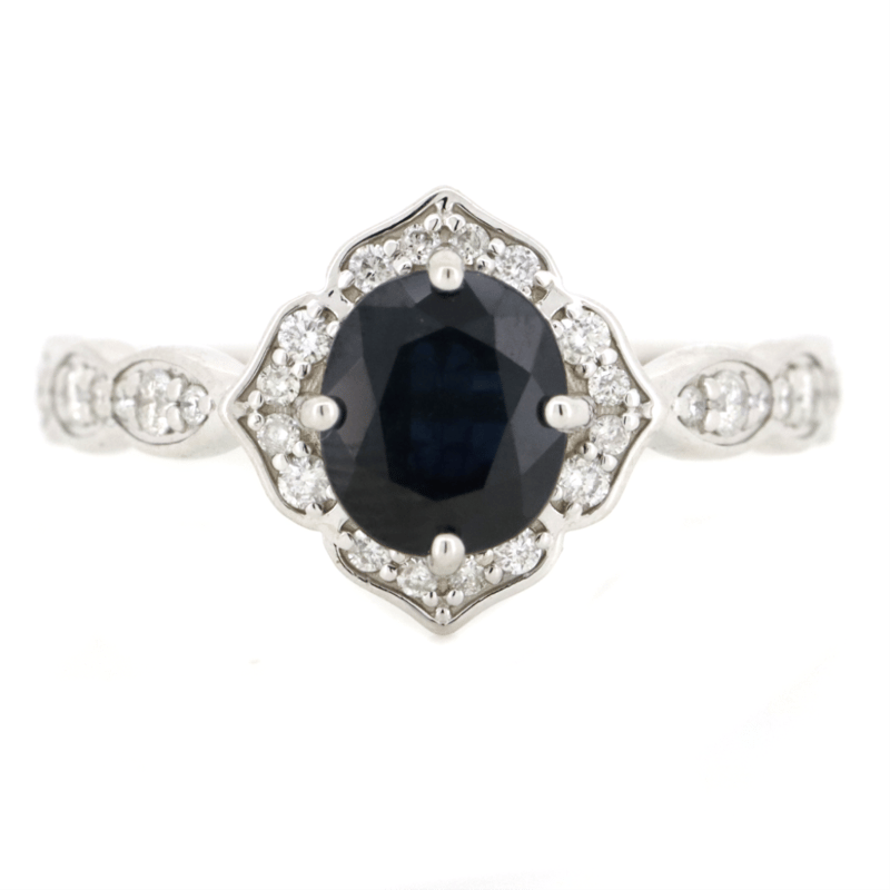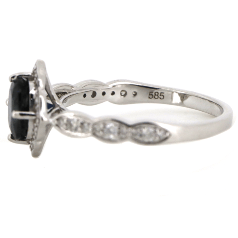 14K WHITE GOLD, BLUE SAPPHIRE AND DIAMOND, HALO RING.