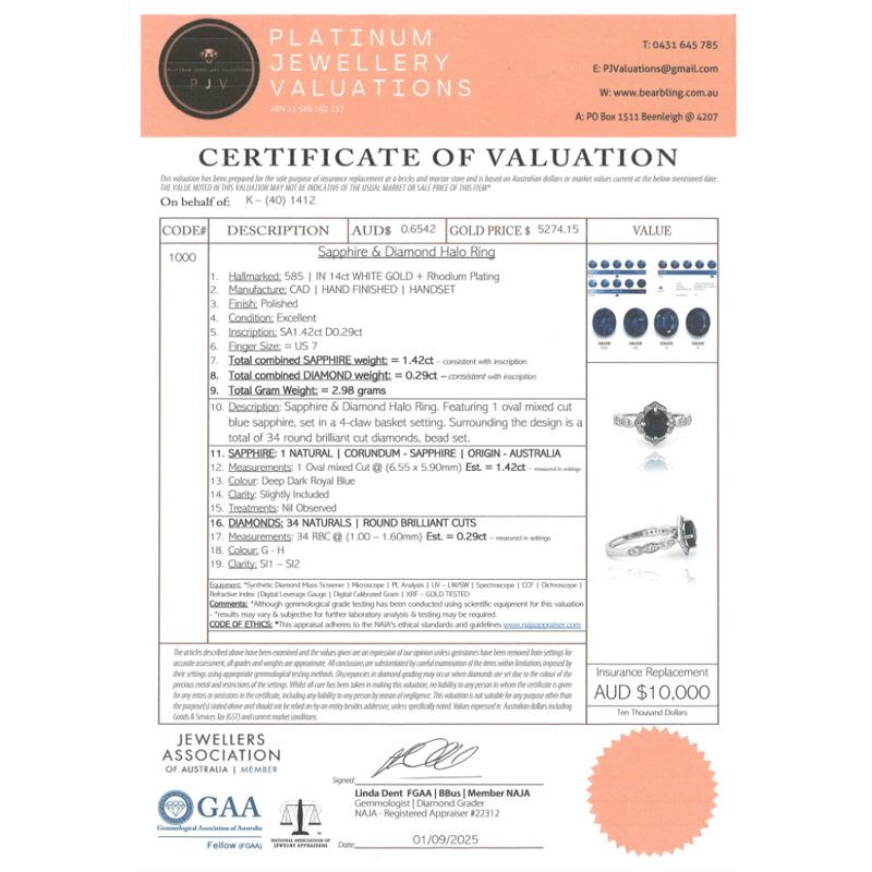 The Centre Features, One Oval Cut Blue, Sapphire (1.42Ct, Slightly Included), 4 Claw Set. Surrounding The Design Are, 34 Round Brilliant Cut, Diamonds (0.29Ct Tdw, G-H Colour, Si1-Si2 Clarity), Bead Set. Ring Size N 1/2.