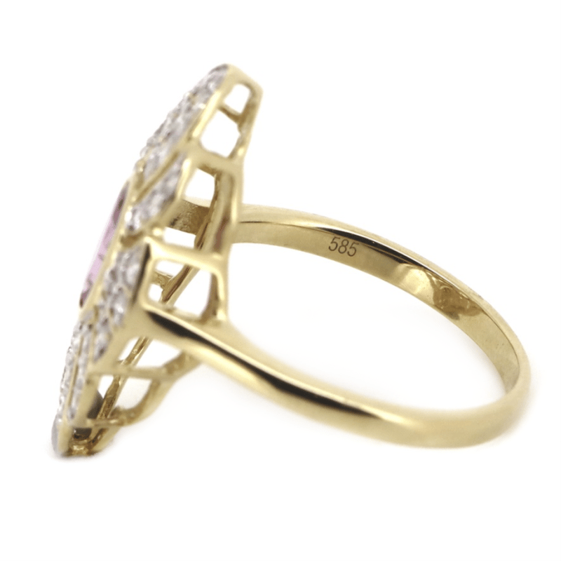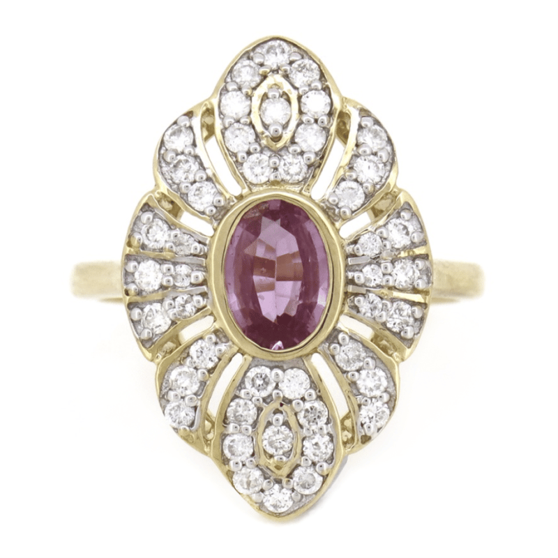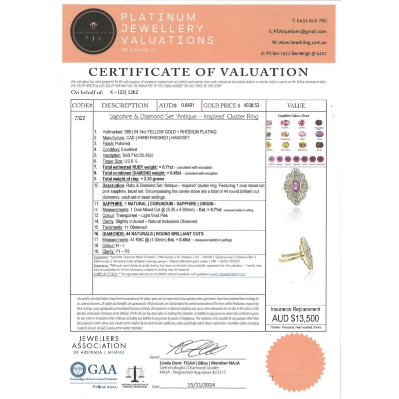 14K YELLOW GOLD, PINK SAPPHIRE AND DIAMOND, ANTIQUE INSPIRED RING. The Centre Features, One Oval Cut, Light Vivid Pink, Sapphire (0.71Ct, Slightly Included With Natural Inclusions), Bezel Set. Encompassing The Stone Are, 44 Round Brilliant Cut, Diamonds (0.45Ct Tdw, H-I Colour, P1-P2 Clarity), Bead Set. Ring Size L 1/2. Valuations Provided by an Independent Third-Party Professional Not Directly Associated With Lloyds Auctions at AUD $$13,500.00This valuation has been conducted by an independent third-party professional. The valuation amount is an assessment by the issuing valuer and does not reflect the auction value of the item. Any inquiries regarding the valuation should be directed to the issuing valuer (refer to contact details on the certificate), as Lloyds Auctions has no affiliation or influence over the valuation, the valuer, or the stated amount. Condition: Good - Refer Images 0645965+1539