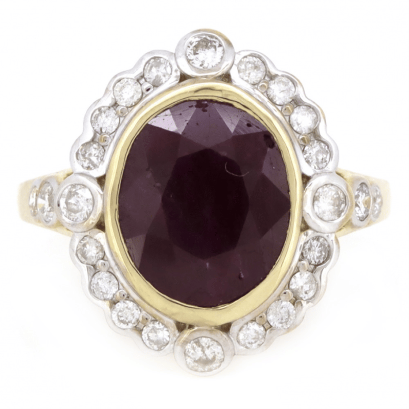 The Centre Features, One Oval Cut, Purplish-Red, Ruby (3.50Ct, Included), Bezel Set. Surrounding The Centre In A Halo And Decorating The Shoulders Are, 24 Round Brilliant Cut, Diamonds (0.55Ct Tdw, J-K Colour, Si2-I2 Clarity), Bezel/Bead Set In White Gold. Ring Size O 1/2.