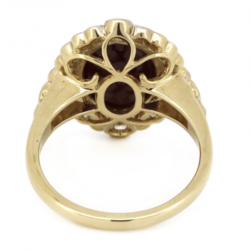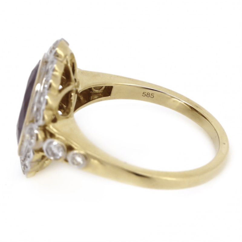 14K YELLOW GOLD, RUBY AND DIAMOND, HALO RING.