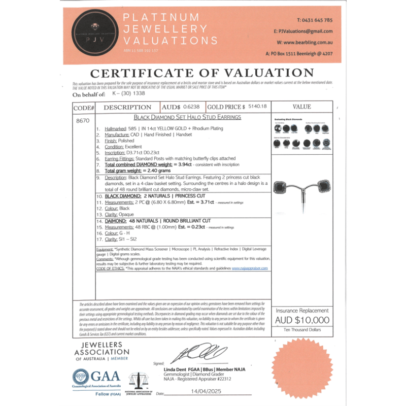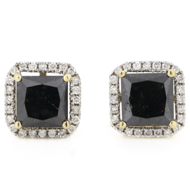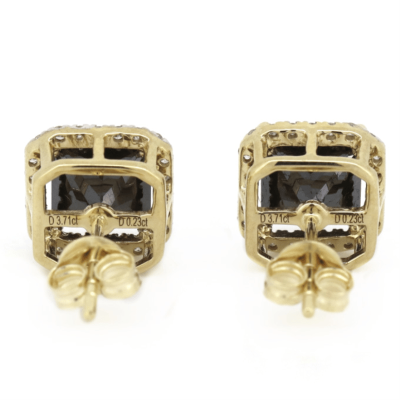 The Centres Feature, 2 Princess Cut, Black Diamond (3.71Ct Tsw, Opaque Clarity), 4 Claw Set In Yellow Gold. Surrounding The Centres In Halos Are 48 Round Brilliant Cut Diamonds (0.23Ct Tdw, G-H Colour, Si1-Si2 Clarity), Micro-Claw Set. The Earrings Have Post Backs, With 14K Yellow Gold Butterfly Clasps.