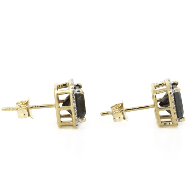14K YELLOW GOLD, BLACK DIAMOND AND DIAMOND, HALO STUD EARRINGS.