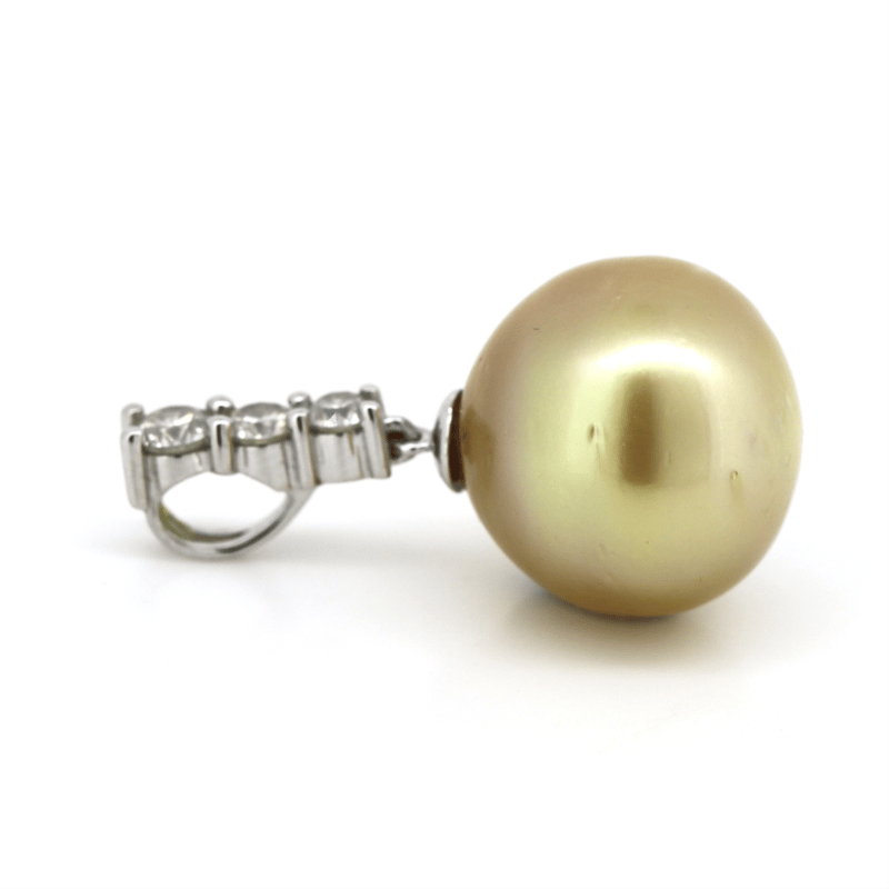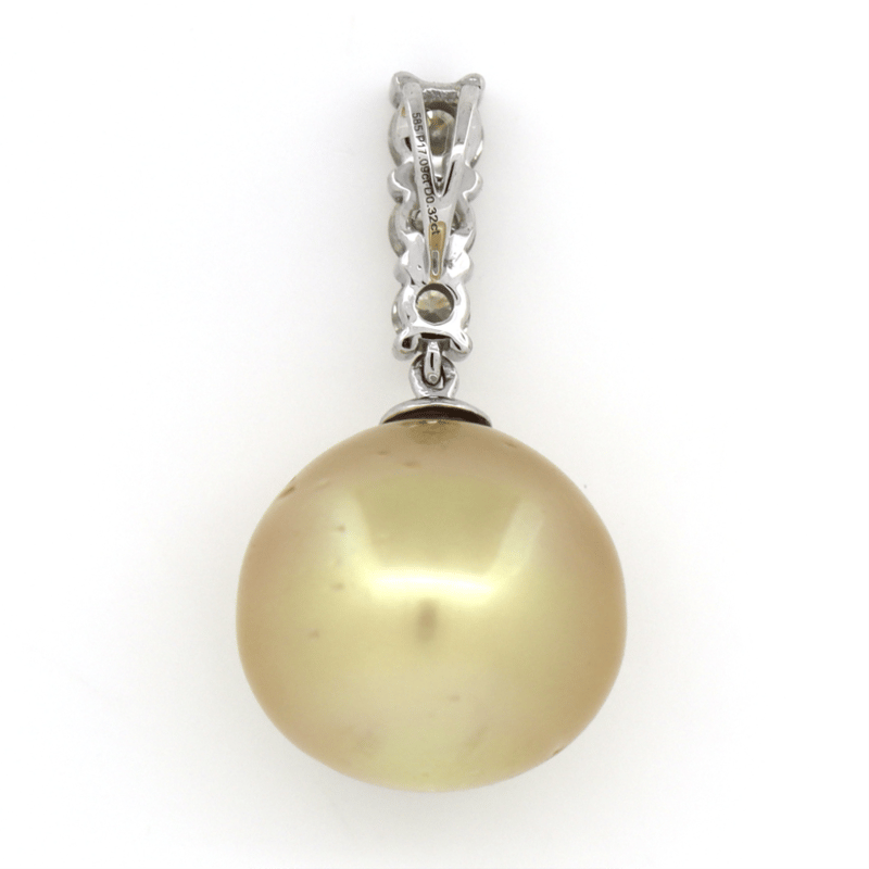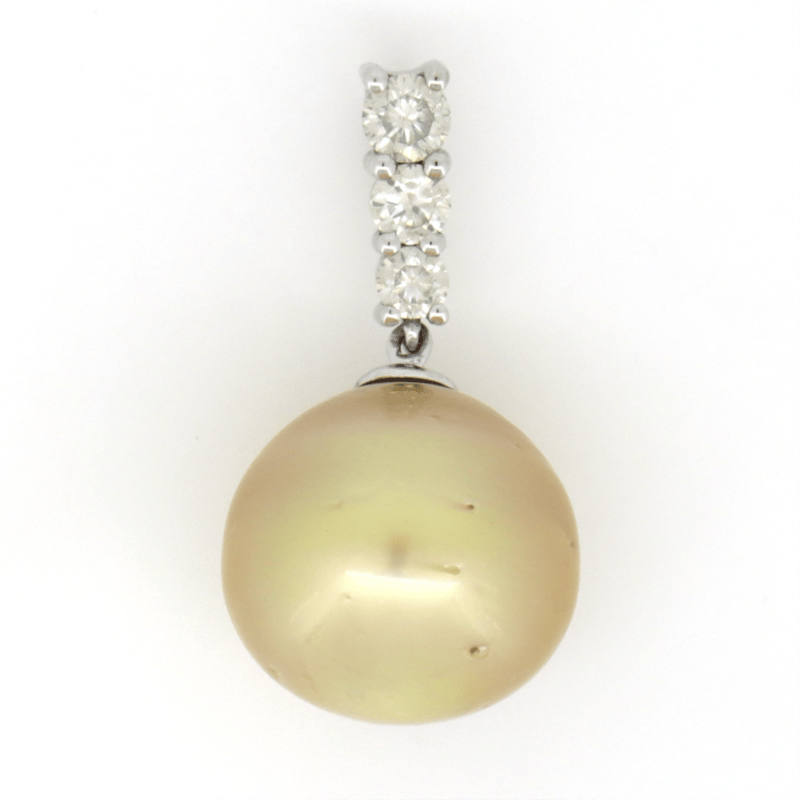 The Design Features, One Near Round, Cream With Gold Overtones, Cultured South Sea Pearl (13.49Mm Size, Slightly Blemished, Medium Lustre), Post Set. Decorating The Bail Are, 3 Round Brilliant Cut, Diamonds (0.32Ct Tdw, J-K Colour, Si1-I2 Clarity), Claw Set.