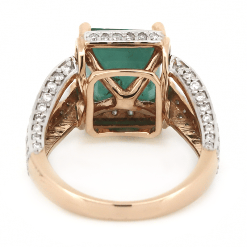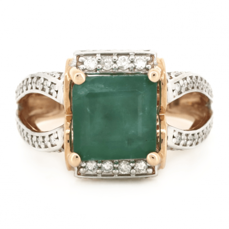14K ROSE GOLD, EMERALD AND DIAMOND, SPLIT BAND RING.