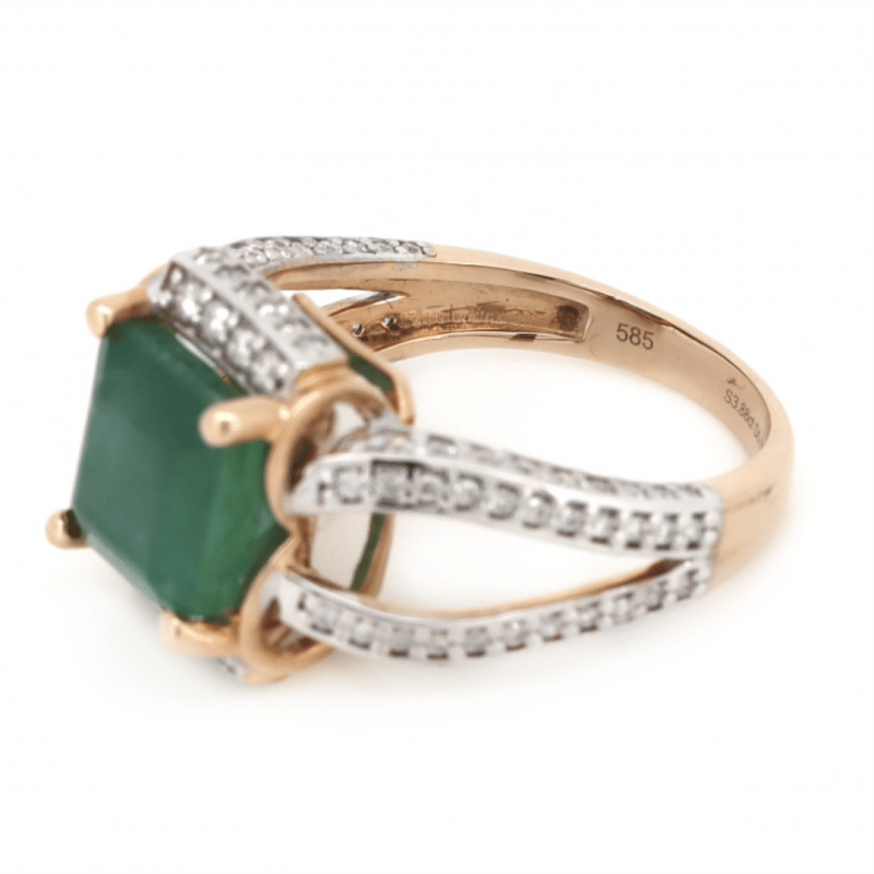 The Centre Features, One Emerald Cut, Deep Green, Emerald (3.88Ct, Included), Claw Set. Bordering The Centre And Decorating The Split Band And Setting Are, 100 Round Brilliant Cut, Diamonds (0.50Ct Tdw, J-K Colour, Si2-P2 Clarity), Bead Set. Ring Size M.