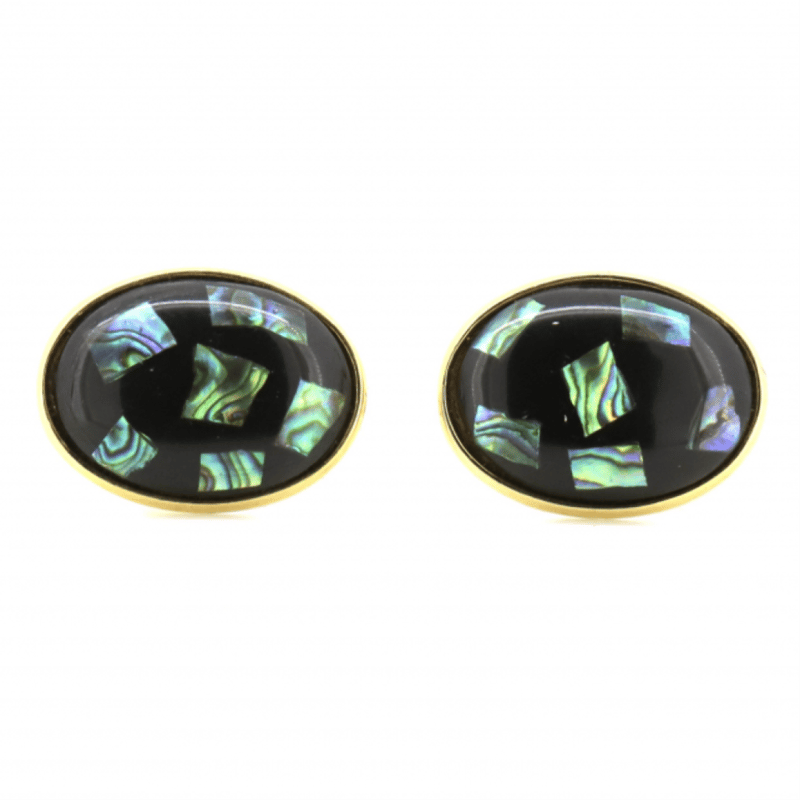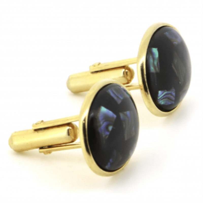PAIR OF GOLD COLOURED, ABALONE SHELL AND BLACK ENAMEL CUFFLINKS.
