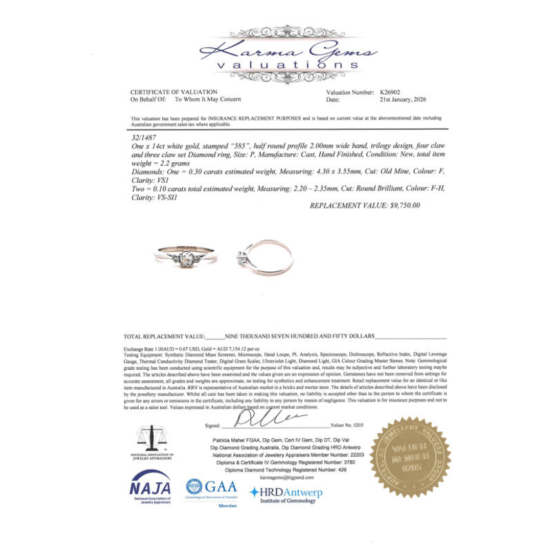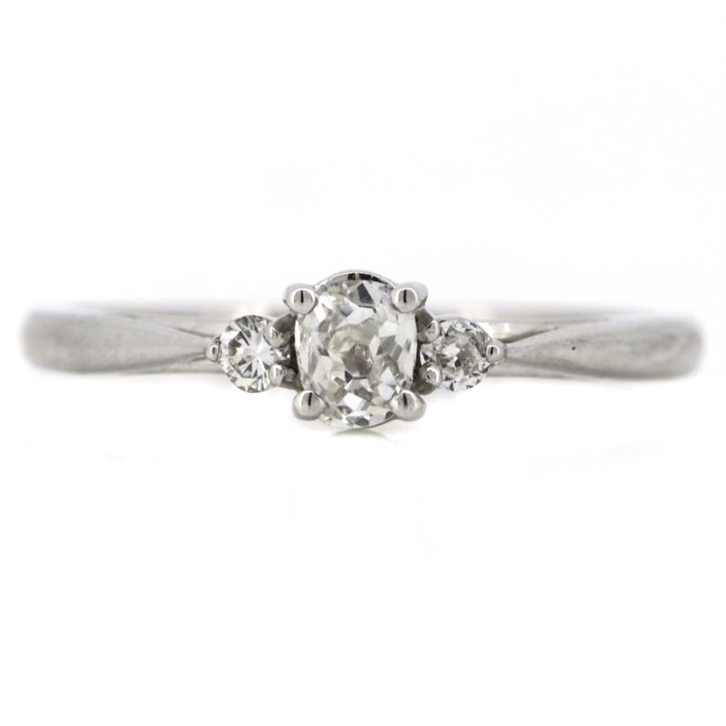 The Centre Features, One Old Mine Cut, Diamond (0.30Ct, F Colour, Vs1 Clarity), 4 Claw Set. Flanking The Centre Are, 2 Round Brilliant Cut, Diamonds (0.10Ct Tdw, F-H Colour, Vs-Si1 Clarity), Claw Set. Ring Size P.
