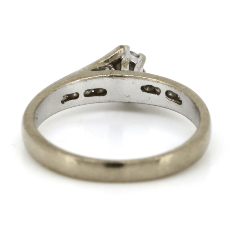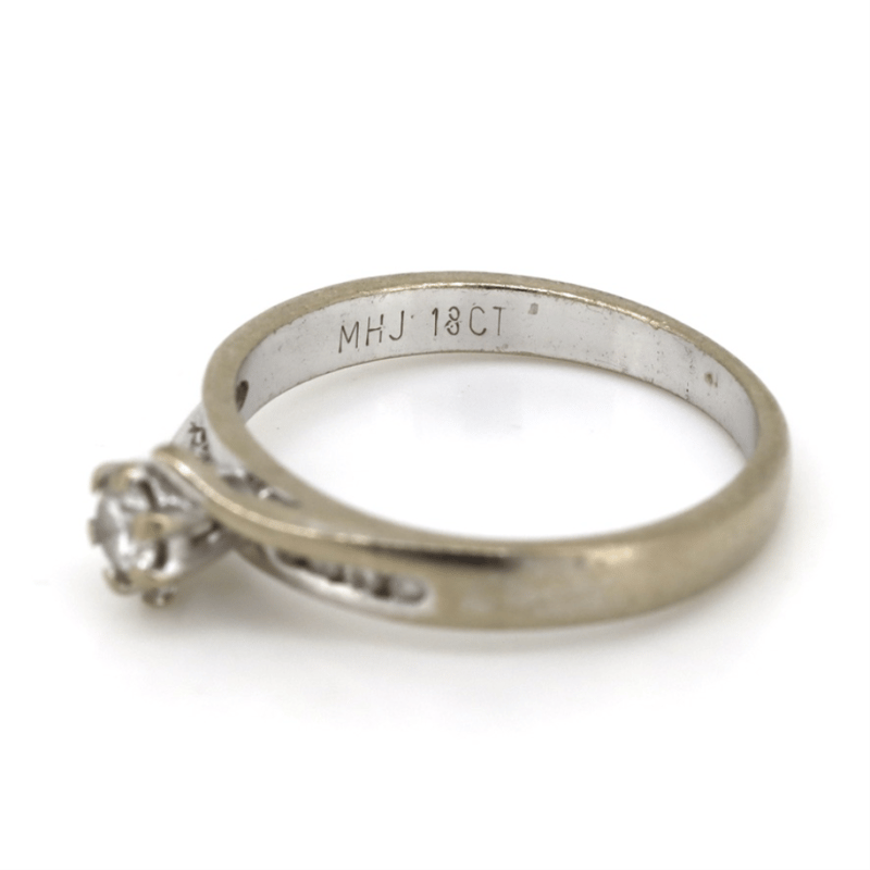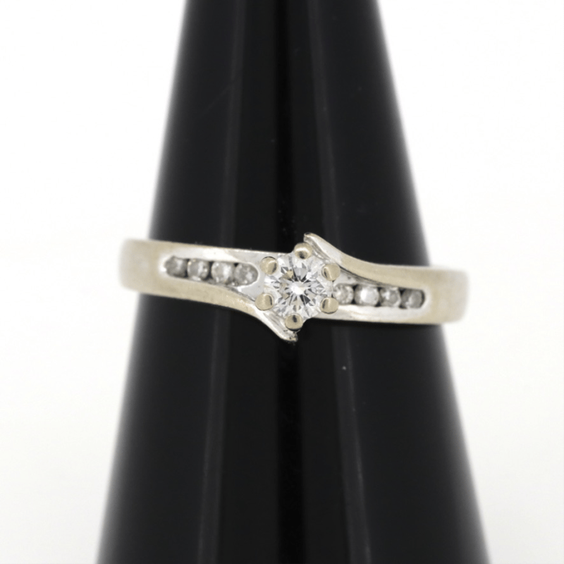 The Centre Features, One Round Brilliant Cut, Diamond (0.25Ct Tdw, I-J Colour, Si2 Clarity) Claw Set. Along The Sides Are, 8 Round Brilliant Cut, Diamonds (0.08Ct Tdw, I-J Colour, Si1-Si2 Clarity), Channel Set. Ring Size L. Condition: Pre-Owned.