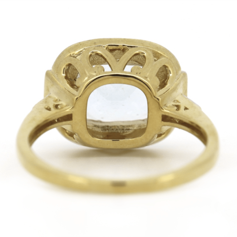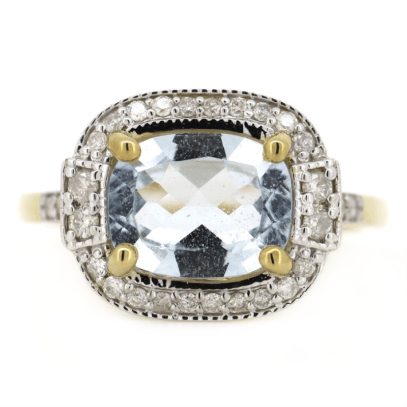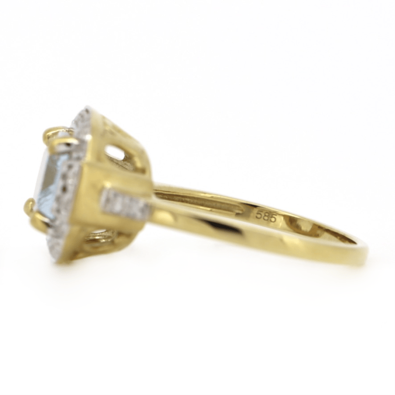 14K YELLOW GOLD, AQUAMARINE AND DIAMOND, HALO RING.