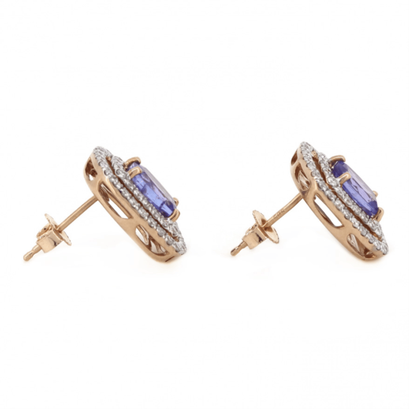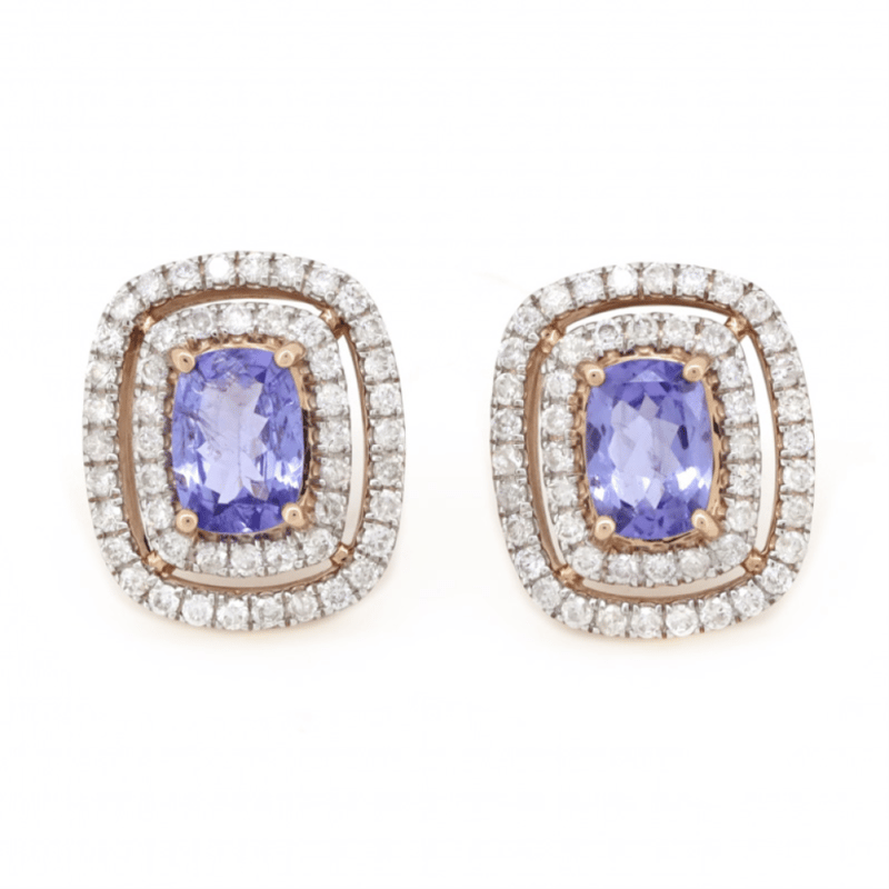 The Centres Feature, 2 Rectangular Cushion Faceted Cut, Purplish-Blue, Tanzanites (1.97Ct Tsw, Included), 4 Claw Set. Surrounding The Centres In Double Halos Are, 100 Round Brilliant Cut, Diamonds (0.83Ct Tdw, I-K Colour, P1-P2 Clarity), Claw Set. The Earrings Have Post Backs, With 14K Rose Gold Butterfly Clasps.