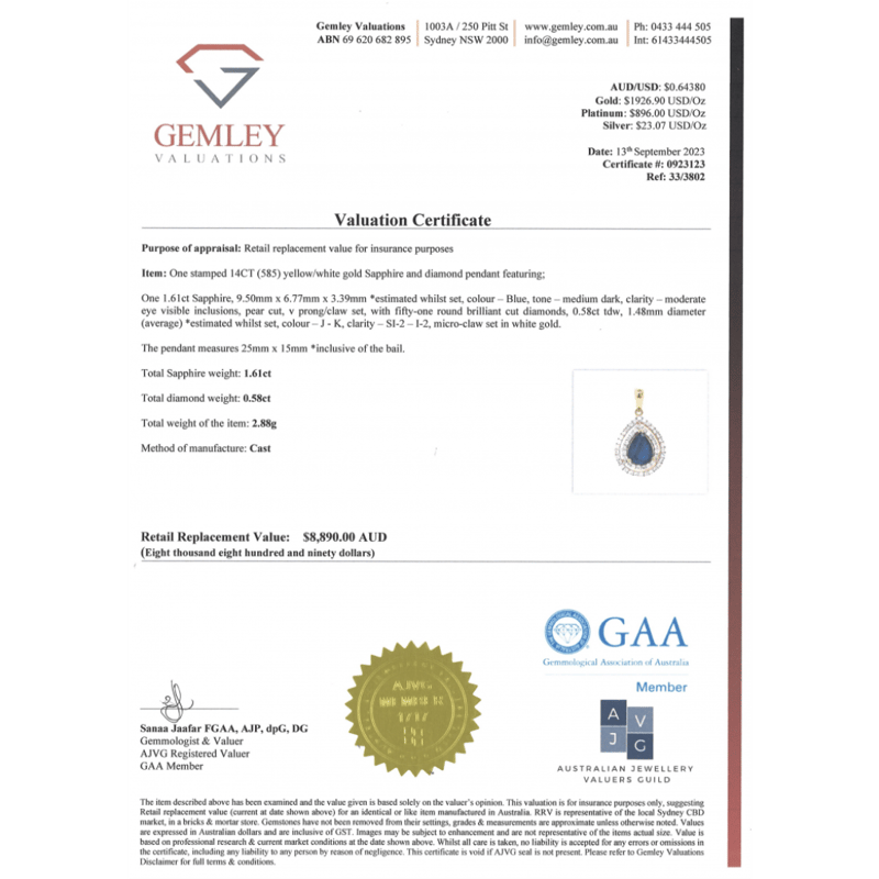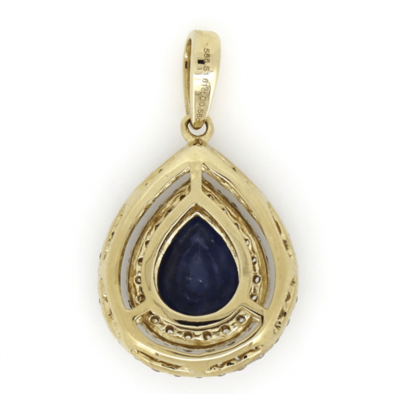 The Centre Features, One Pear Cut, Medium Dark Blue, Sapphire (1.61Ct, Moderate Eye Visible Inclusions), V Prong/Claw Set. Surrounding The Centre In A Double Halo Are, 51 Round Brilliant Cut, Diamonds (0.58Ct Tdw, J-K Colour, Si2-I2 Clarity), Micro-Claw Set In White Gold.