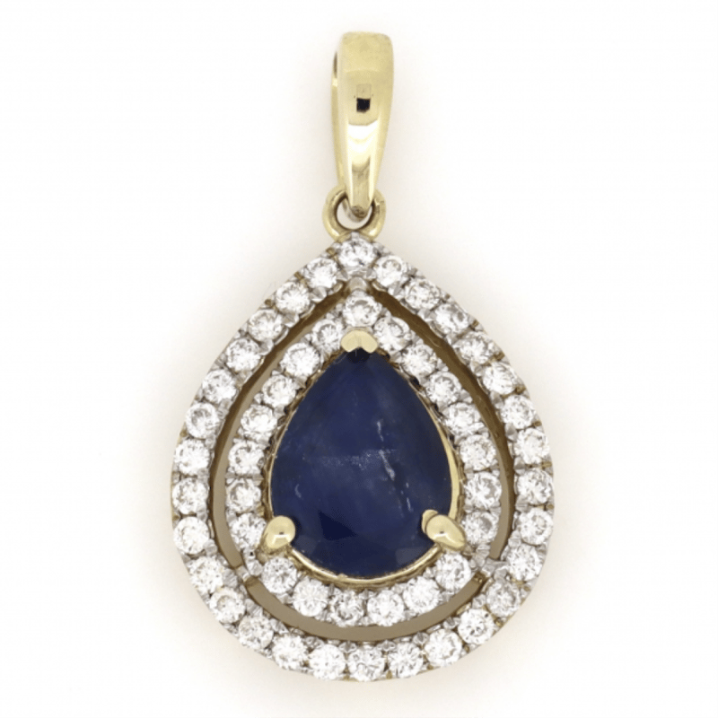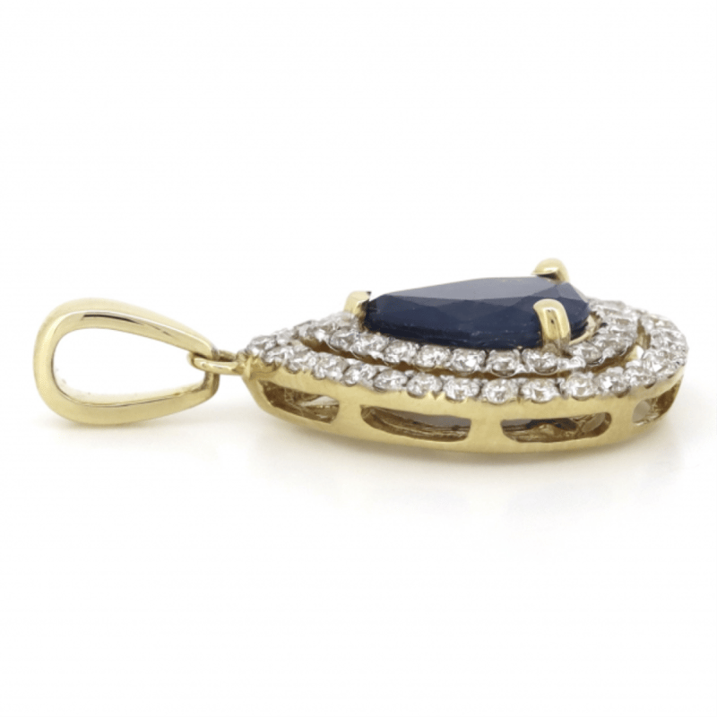 14K YELLOW GOLD, BLUE SAPPHIRE AND DIAMOND, DOUBLE HALO PENDANT.