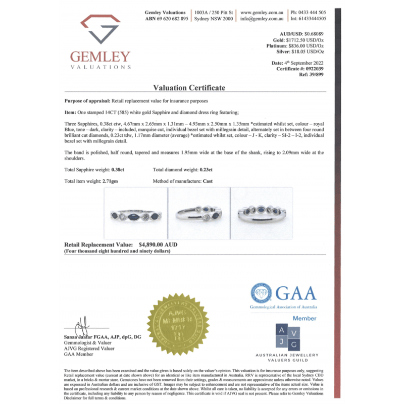 The Centre Features, 3 Marquise Cut, Dark Royal Blue, Sapphires (0.38Ct Tsw, Included), Bezel Set With Millegrain Detail. Alternating Between Are, 4 Round Brilliant Cut, Diamonds (0.23Ct Tdw, J-K Colour, Si2-I2 Clarity), Bezel Set With Millegrain Detail. Ring Size M 1/2.