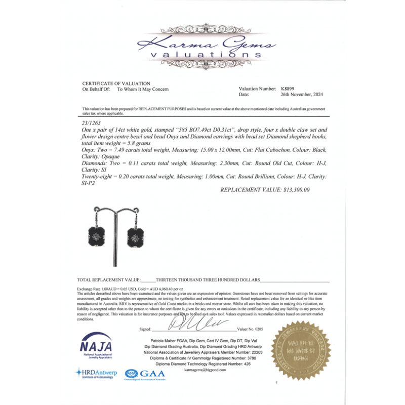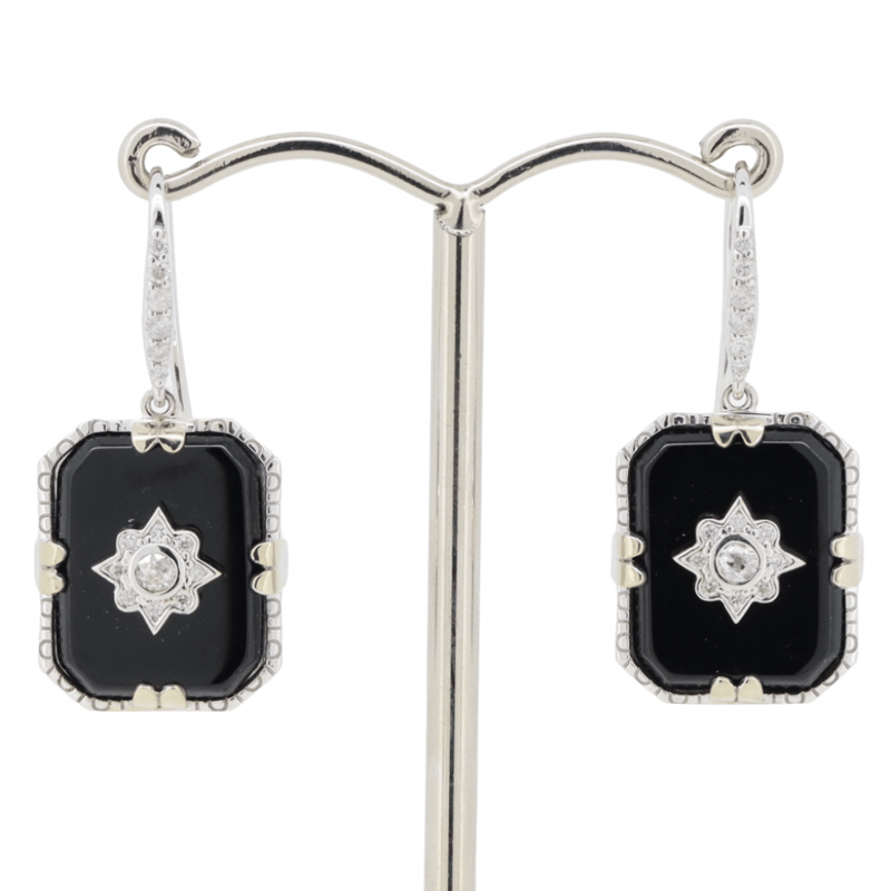 The Centres Feature, 2 Flat Cabochon Cut, Black, Onyx'S (7.49Ct Tsw, Opaque), Bezel Set. Centering The Onyx And Decorating The Drops Are, 28 Round Brilliant Cut, Diamonds (0.20Ct, H-J Colour, Si-P2 Clarity), And 2 Round Old Cut, Diamonds (0.11Ct Tdw, H-J Colour, Si Clarity), Bead Set. The Earrings Feature, 14K White Gold Shepherd Hooks.