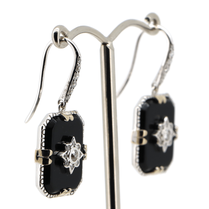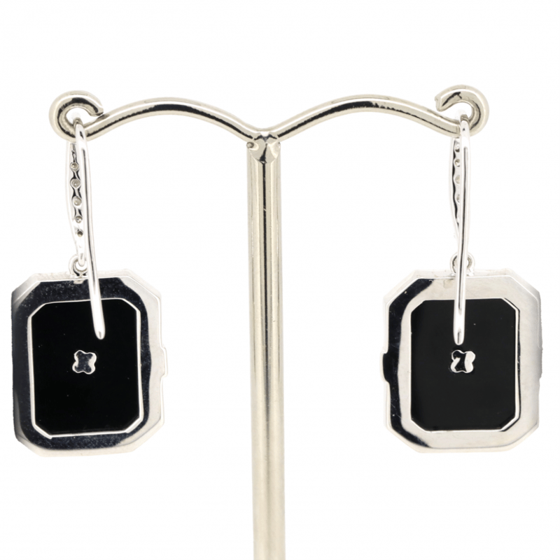 14K WHITE GOLD, ONYX AND DIAMOND, DROP EARRINGS.