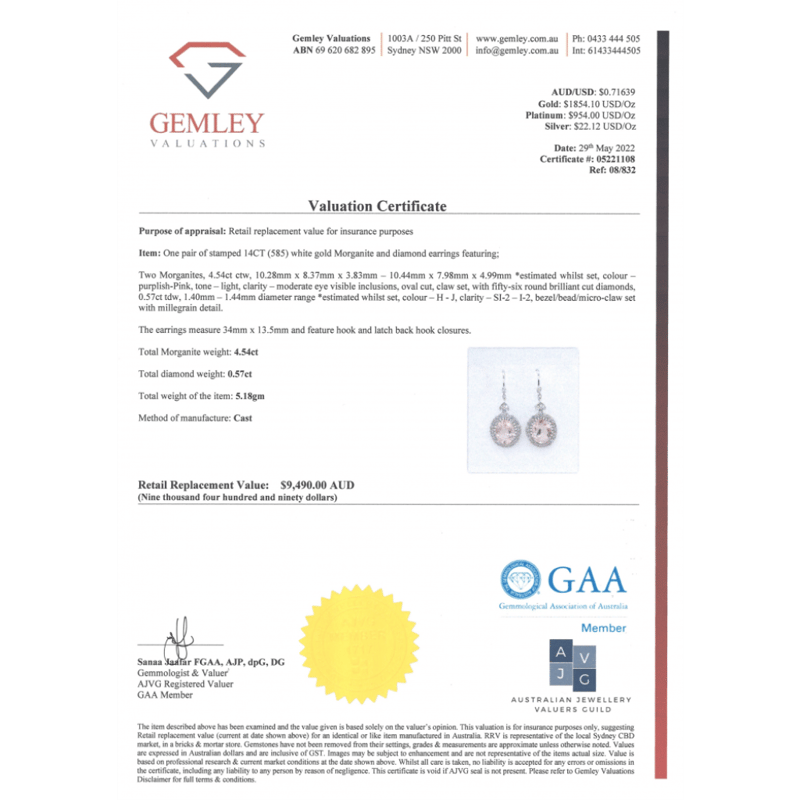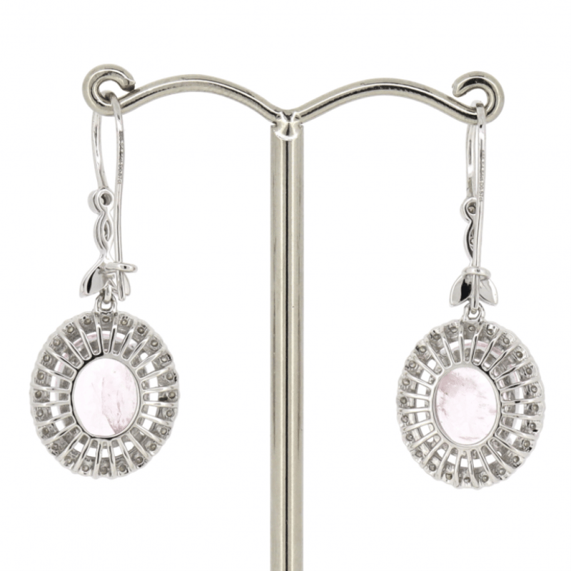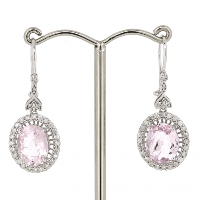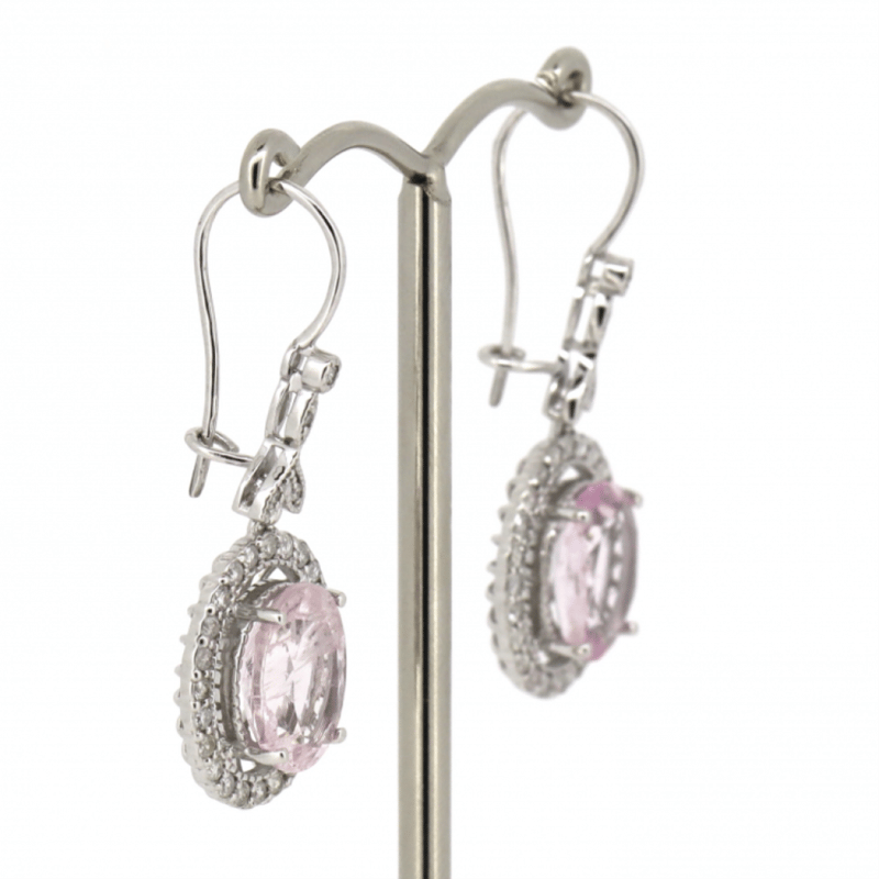 The Centres Feature, 2 Oval Cut, Light Purplish-Pink, Morganites (4.54Ct Tsw, Moderate Eye Visible Inclusions), Claw Set. Surrounding The Centres In Halos And Decorating The Drops Are, 56 Round Brilliant Cut, Diamonds (0.57Ct Tdw, H-J Colour, Si2-I2 Clarity), Bezel/Bead/Micro-Claw Set With Mill Grain Detail. The Earrings Have Latch Backs.