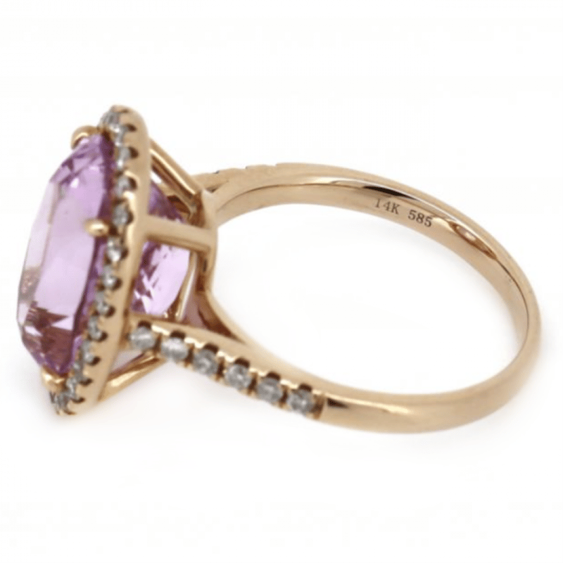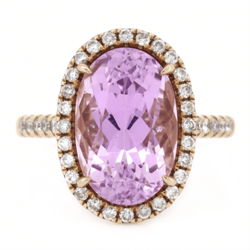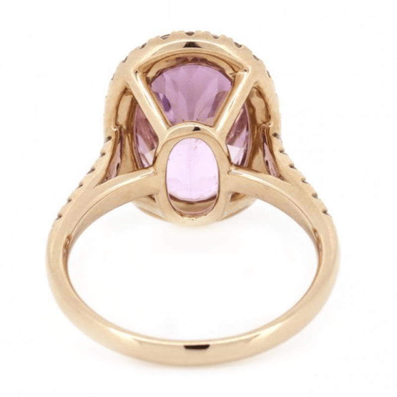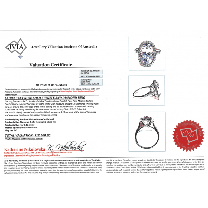 14K ROSE GOLD, 6.47CT KUNZITE AND DIAMOND, STATEMENT RING. The Centre Features, One Oval Faceted Cut, Purplish-Pink, Kunzite (6.47Ct, Slightly Included), 4 Claw Set. Surrounding The Centre In A Halo And Decorating The Band Are, 40 Round Brilliant Cut, Diamonds (0.42Ct Tdw, I-K Colour, Si2-P2 Clarity), Claw Set. Ring Size M. Valuations Provided by an Independent Third-Party Professional Not Directly Associated With Lloyds Auctions at AUD $$12,500.00This valuation has been conducted by an independent third-party professional. The valuation amount is an assessment by the issuing valuer and does not reflect the auction value of the item. Any inquiries regarding the valuation should be directed to the issuing valuer (refer to contact details on the certificate), as Lloyds Auctions has no affiliation or influence over the valuation, the valuer, or the stated amount. Condition: Good - Refer Images 0645969+1638