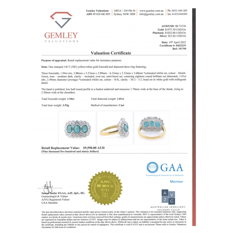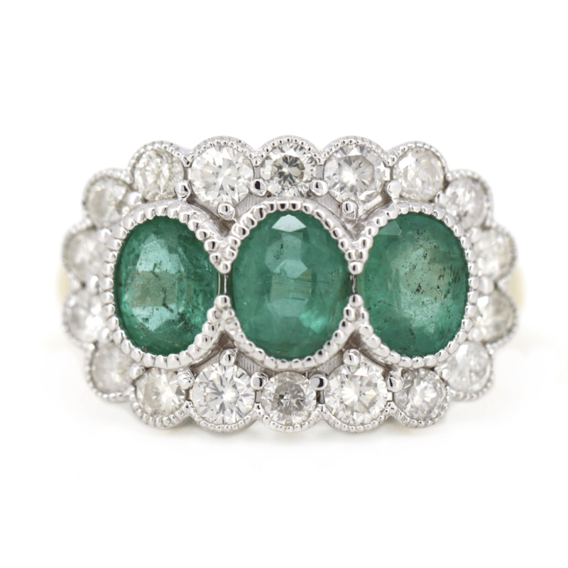 The Centre Features, 3 Oval Cut, Medium Dark Bluish-Green, Emeralds (1.94Ct Tsw, Included), Semi-Bezel Set. Encompassing The Centre Are, 18 Round Brilliant Cut, Diamonds (1.01Ct Tdw, H-K Colour, Si2-I2 Clarity), Bead Set In White Gold With Millegrain Detail. Ring Size L 1/2.