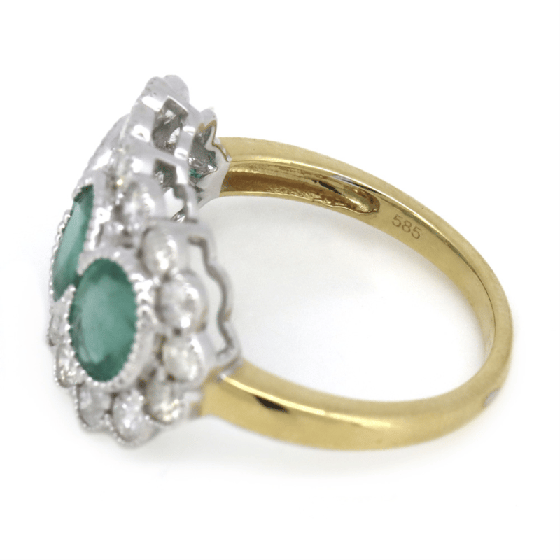 14K YELLOW/WHITE GOLD, EMERALD AND DIAMOND, HALO TRILOGY RING.
