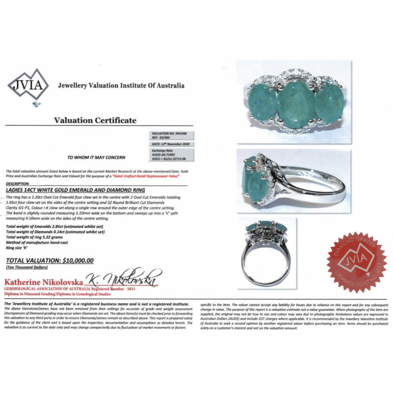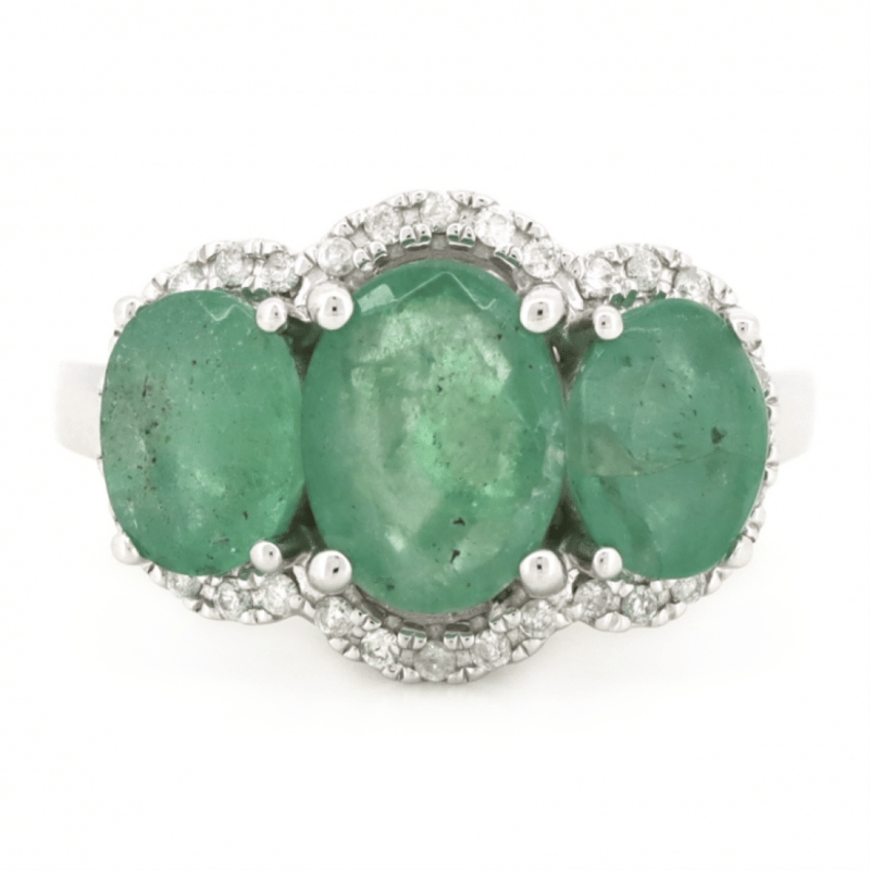The Design Features, 3 Oval Cut, Green, Emeralds (2.85Ct Tsw, Visible Inclusions), Claw Set. Encompassing The Design Are, 32 Round Brilliant Cut, Diamonds (0.14Ct Tdw, I-K Colour, Si1-P1 Clarity), Claw Set. Ring Size J 1/2.