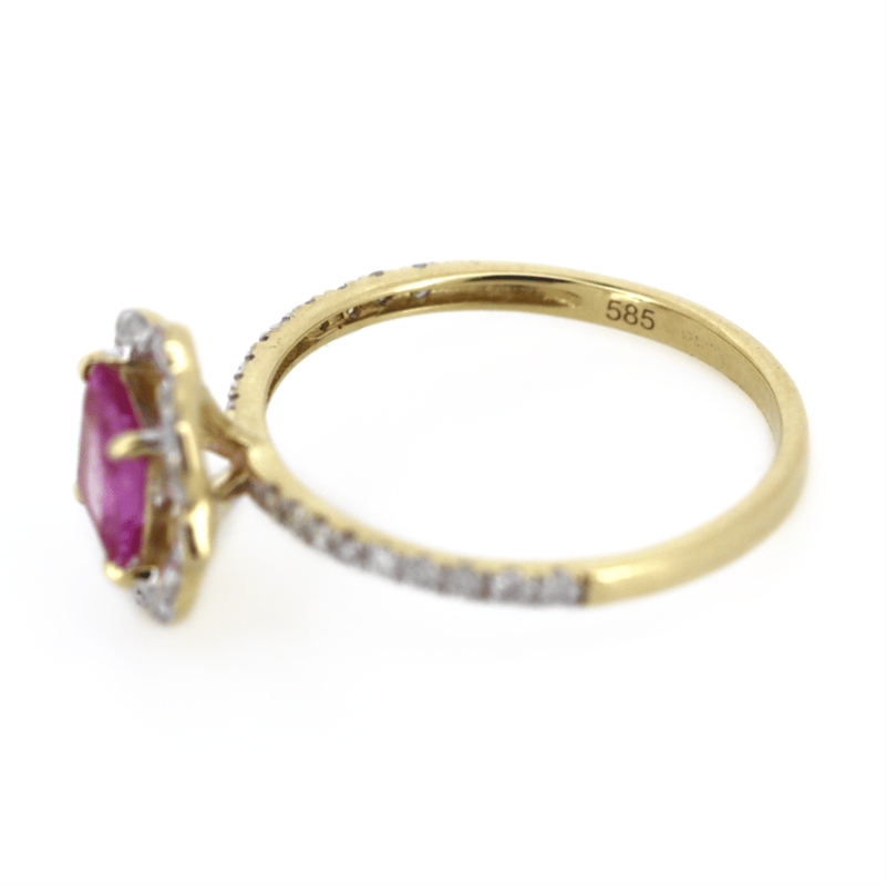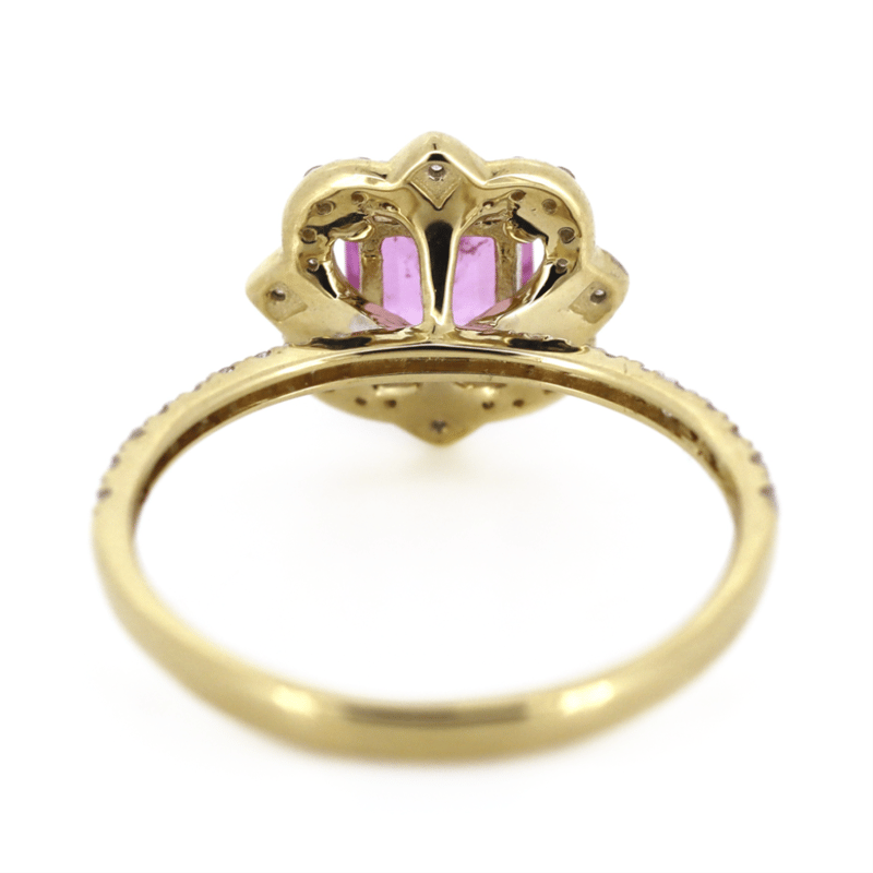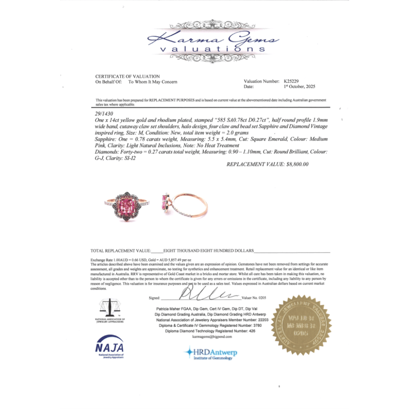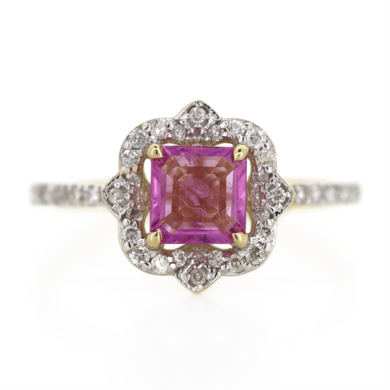 14K YELLOW GOLD/RHODIUM, PINK SAPPHIRE AND DIAMOND, HALO DRESS RING. The Centre Features, One Square Emerald Cut, Medium Pink, Sapphire (0.78Ct, Light Natural Inclusions), 4 Claw Set In Yellow Gold. Surrounding The Centre And Decorating The Band Are, 42 Round Brilliant Cut, Diamonds (0.27Ct Tdw, G-J Colour, Si-I2 Clarity), Bead Set With Rhodium Plating. Ring Size M. Valuations Provided by an Independent Third-Party Professional Not Directly Associated With Lloyds Auctions at AUD $$8,800.00This valuation has been conducted by an independent third-party professional. The valuation amount is an assessment by the issuing valuer and does not reflect the auction value of the item. Any inquiries regarding the valuation should be directed to the issuing valuer (refer to contact details on the certificate), as Lloyds Auctions has no affiliation or influence over the valuation, the valuer, or the stated amount. Condition: Good - Refer Images 0645969+1645