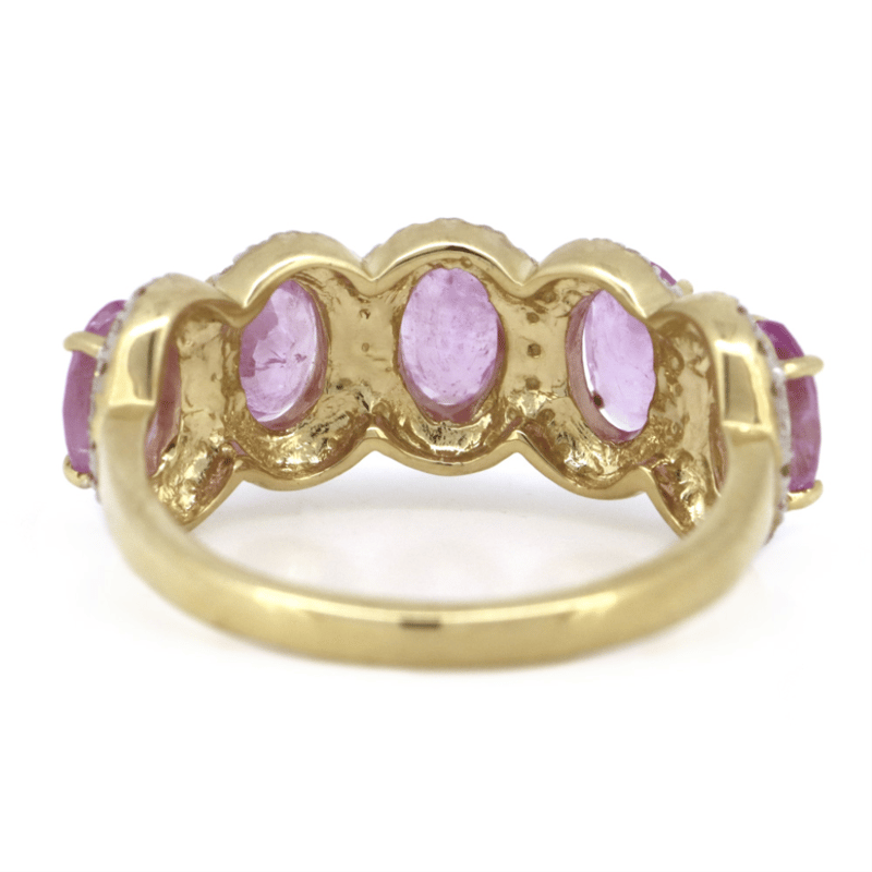 14K YELLOW GOLD, PINK SAPPHIRE AND DIAMOND, DECORATIVE BAND RING. The Design Features, 5 Oval Cut, Medium Reddish-Pink, Sapphires (2.82Ct Tsw, Moderate Eye Visible Inclusions), Claw Set. Surrounding The Sapphires In Individual Halos Are, 78 Round Brilliant Cut, Diamonds (0.38Ct Tdw, J-K Colour, Si2-I2 Clarity), Micro-Claw Set In White Gold. Ring Size M. Valuations Provided by an Independent Third-Party Professional Not Directly Associated With Lloyds Auctions at AUD $$8,390.00This valuation has been conducted by an independent third-party professional. The valuation amount is an assessment by the issuing valuer and does not reflect the auction value of the item. Any inquiries regarding the valuation should be directed to the issuing valuer (refer to contact details on the certificate), as Lloyds Auctions has no affiliation or influence over the valuation, the valuer, or the stated amount. Condition: Good - Refer Images 0645969+1647