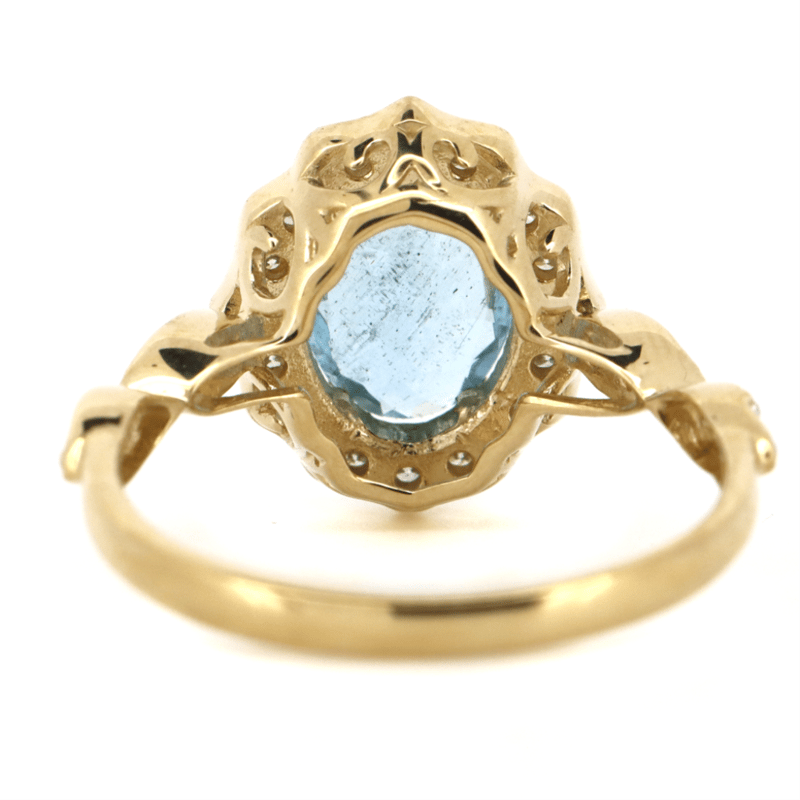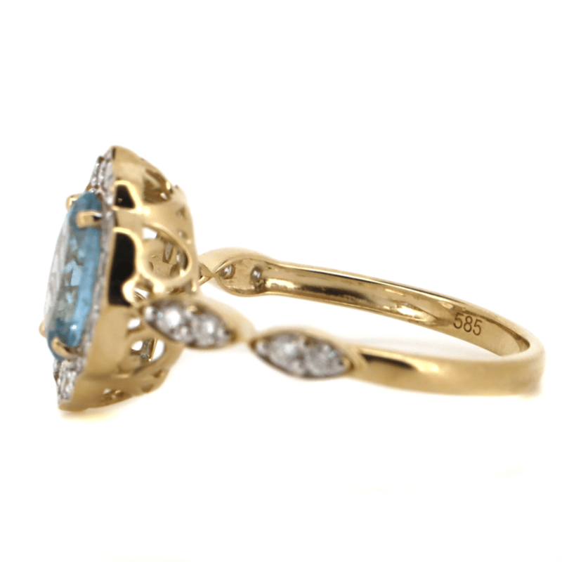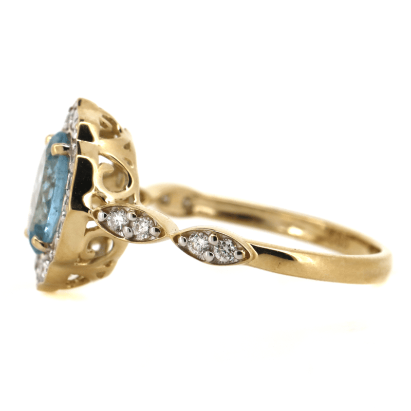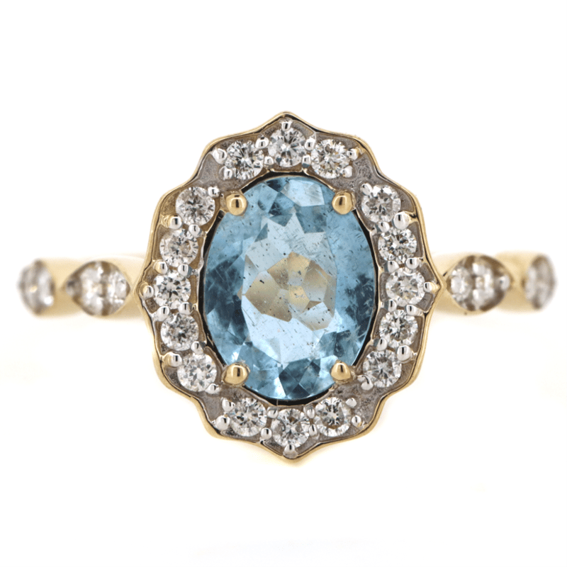 14K YELLOW GOLD, AQUAMARINE AND DIAMOND, ANTIQUE INSPIRED HALO RING.