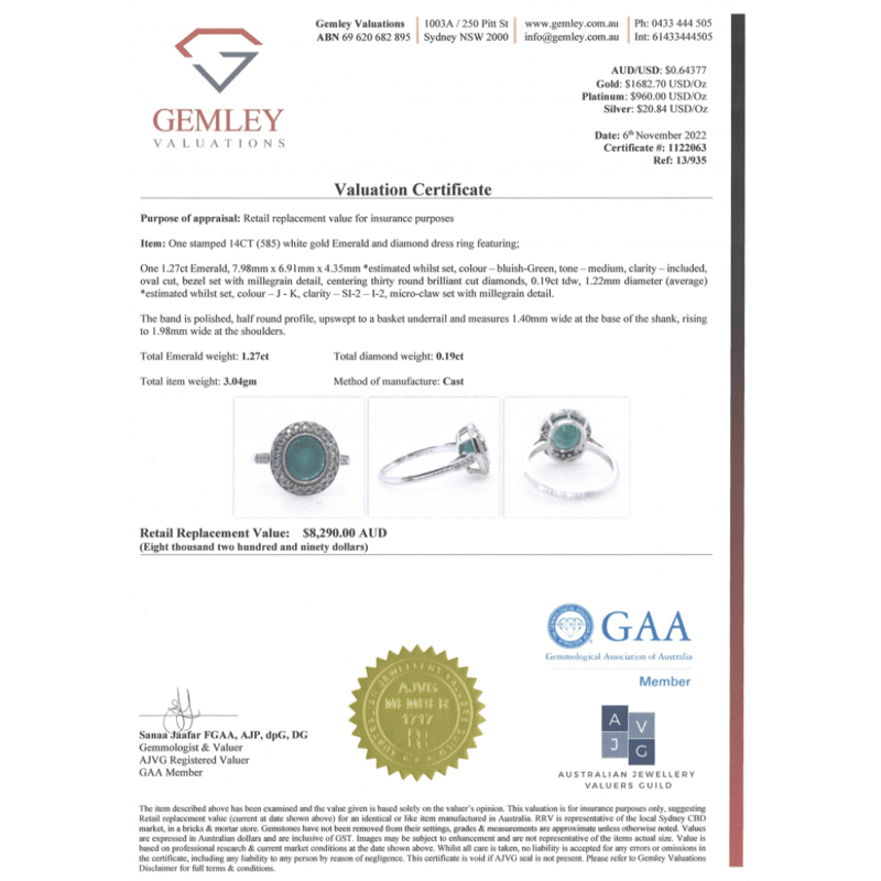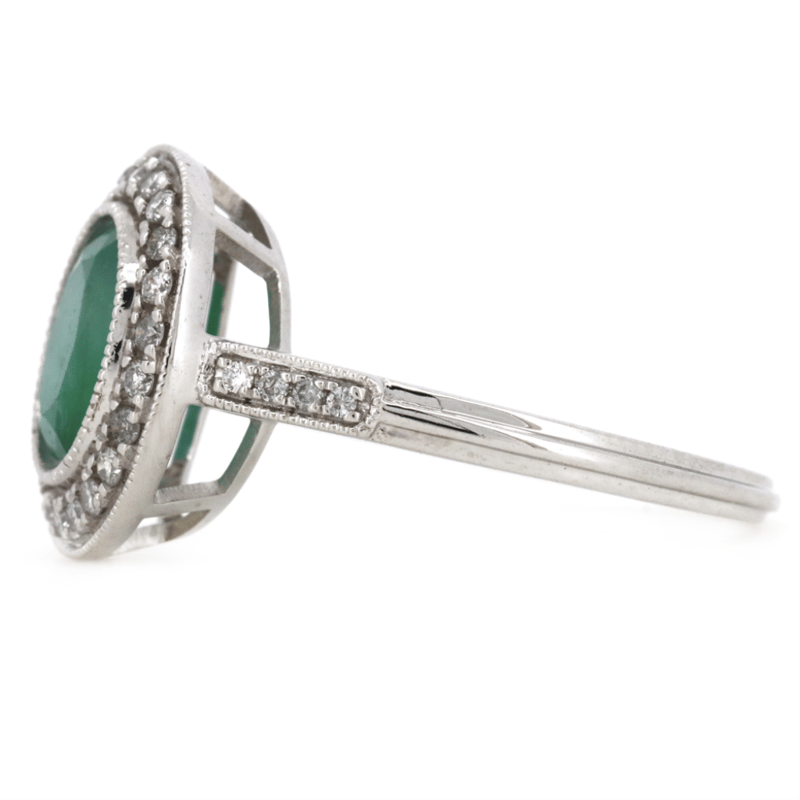 The Centre Features, One Oval Cut, Bluish-Green, Emerald (1.27Ct, Included), Bezel Set With Millegrain Detail. Surrounding The Centre In A Halo And Decorating The Shoulders Are, 30 Round Brilliant Cut, Diamonds (0.19Ct Tdw, J-K Colour, Si2-I2 Clarity), Micro-Claw Set With Millegrain Detail. Ring Size M.