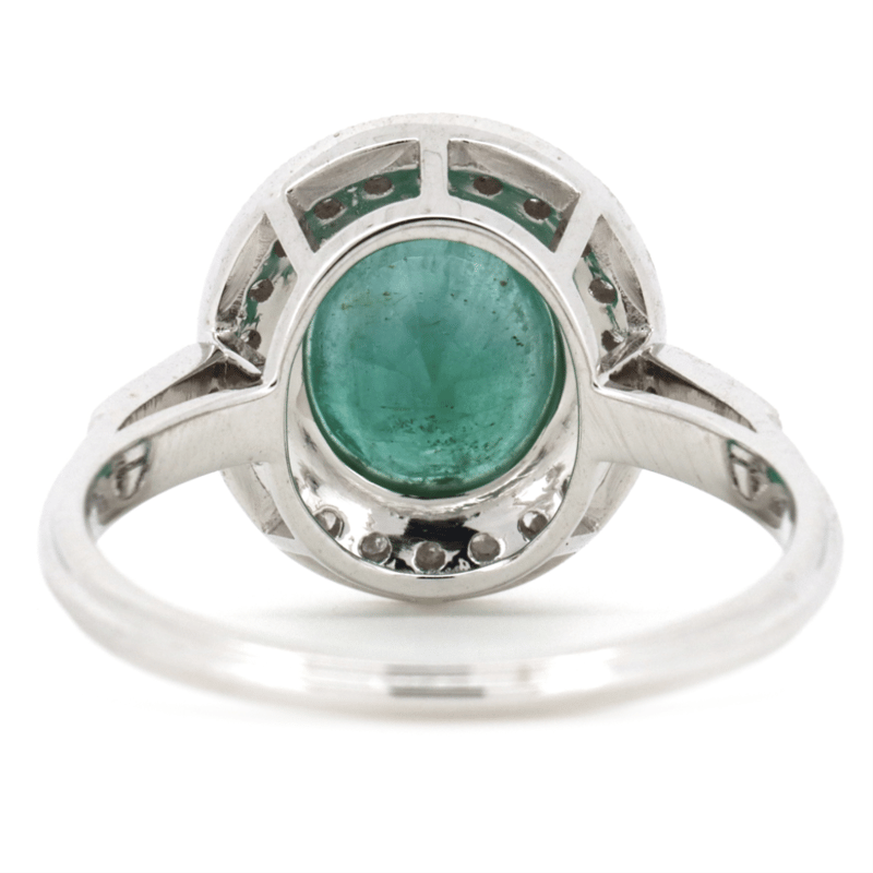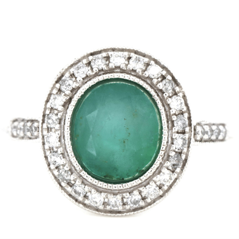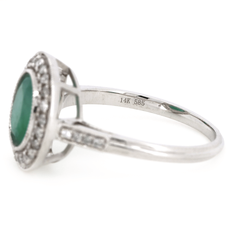 14K WHITE GOLD, EMERALD AND DIAMOND, HALO RING.