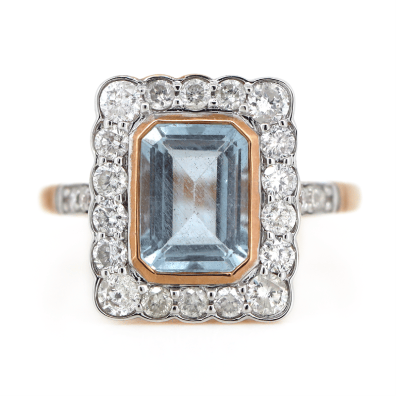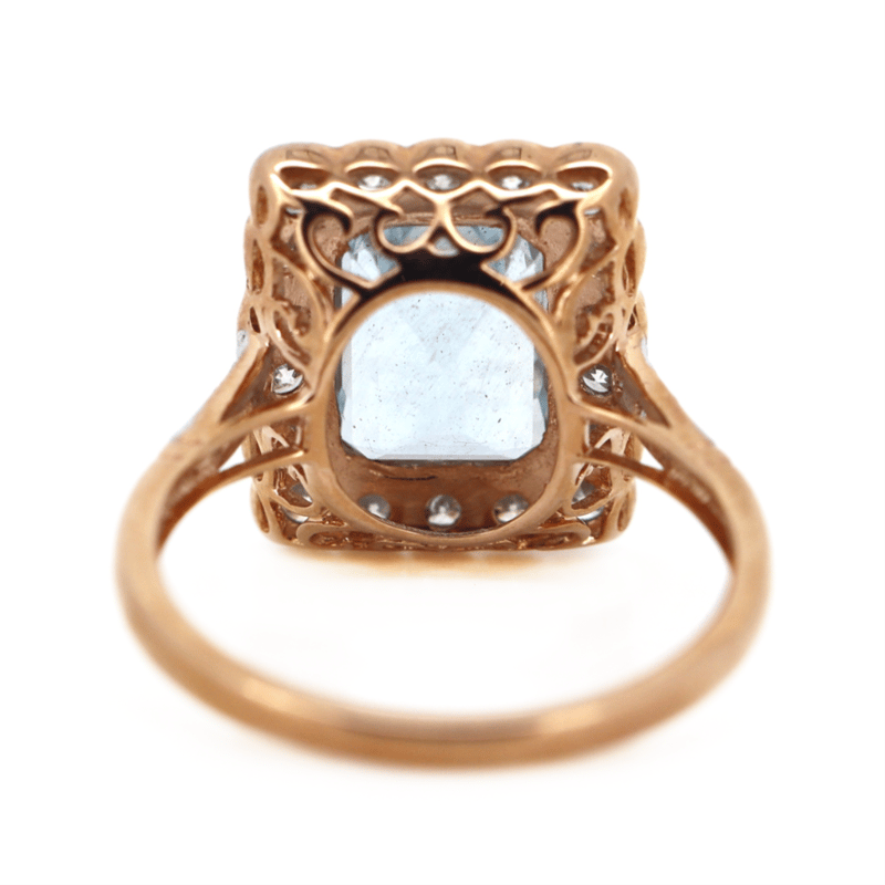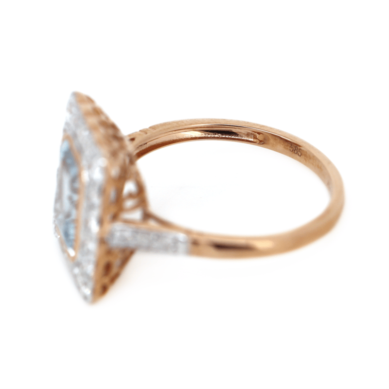 14K ROSE GOLD, AQUAMARINE AND DIAMOND, HALO RING.