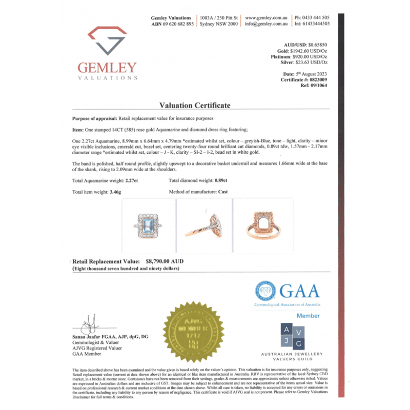 The Centre Features, One Emerald Cut, Light Greyish-Blue, Aquamarine (2.27Ct, Minor Eye Visible Inclusions), Bezel Set. Surrounding The Centre In A Halo Are, 24 Round Brilliant Cut, Diamonds (0.89Ct Tdw, J-K Colour, Si2-I2 Clarity), Bead Set In White Gold. Ring Size O.