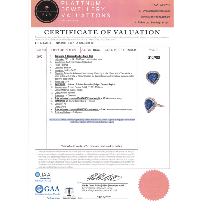 The Centre Features, One Pear Cut, Medium Purplish-Blue, Tanzanite (6.71Ct, Heavily Included), 3 Claw Set. Surrounding The Centre In A Halo And Decorating The Band Are, 24 Round Brilliant Cut, Diamonds (0.60Ct Tdw, H-K Colour, P3+ Clarity), Micro-Claw Set In White Gold. Ring Size: N1/2.