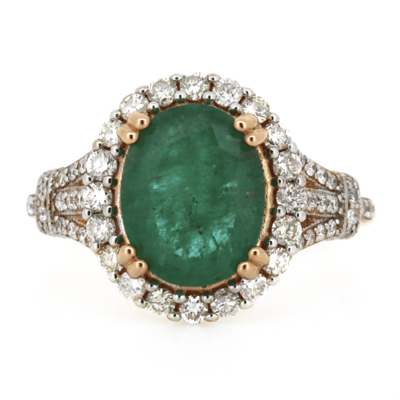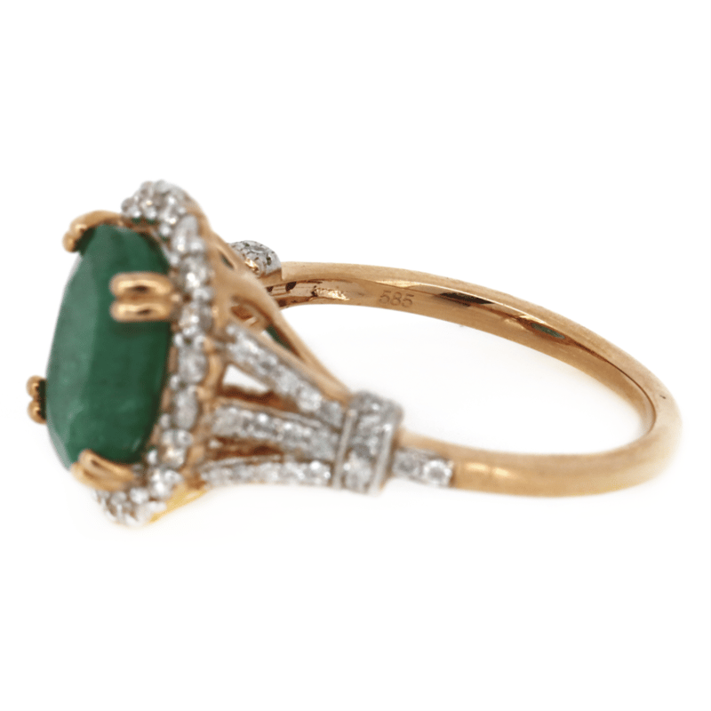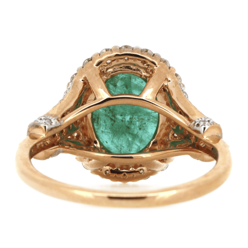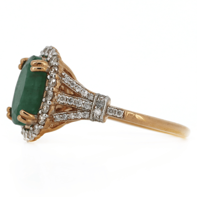 14K ROSE GOLD, EMERALD AND DIAMOND, VINTAGE INSPIRED RING.
