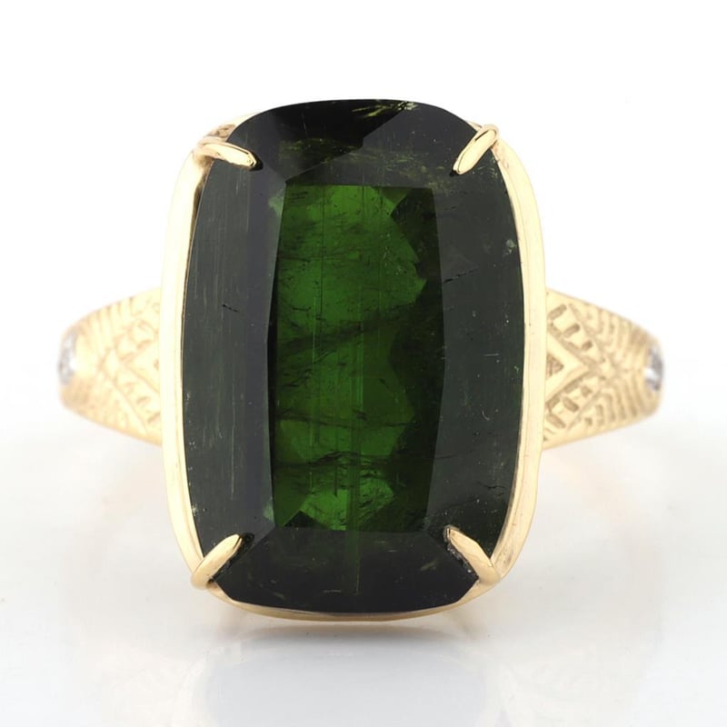The Ring Consists Of (1) Cushion Step Natural Tourmaline. Surrounding The Main Stones Are Round Brilliant Cut Natural Diamonds.