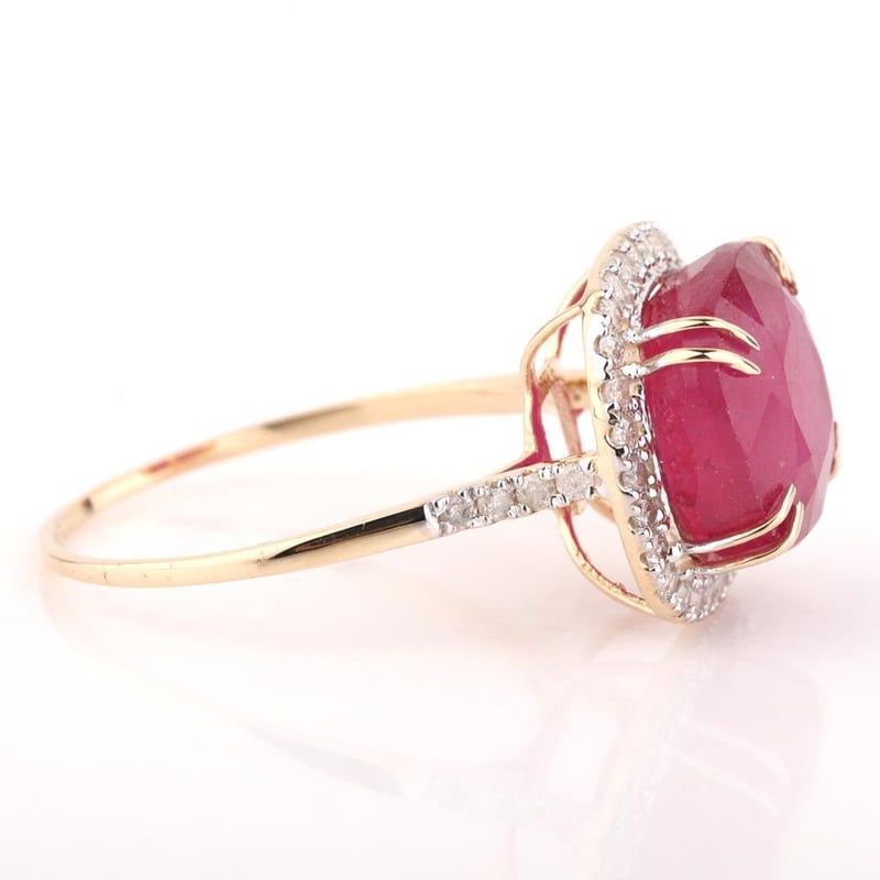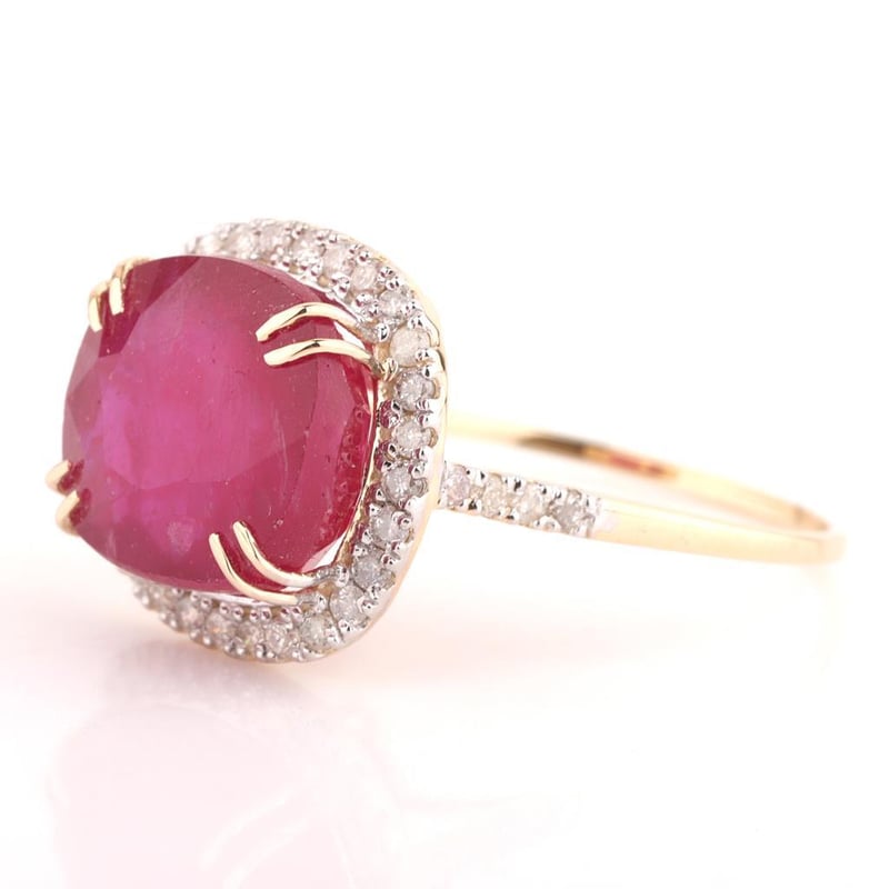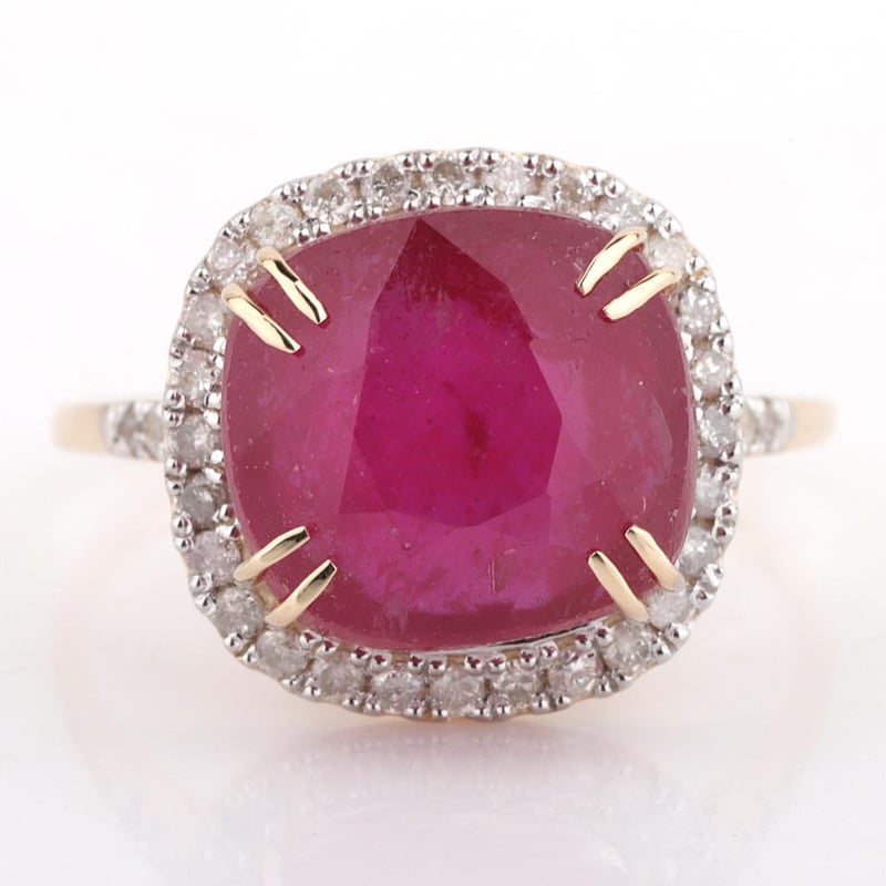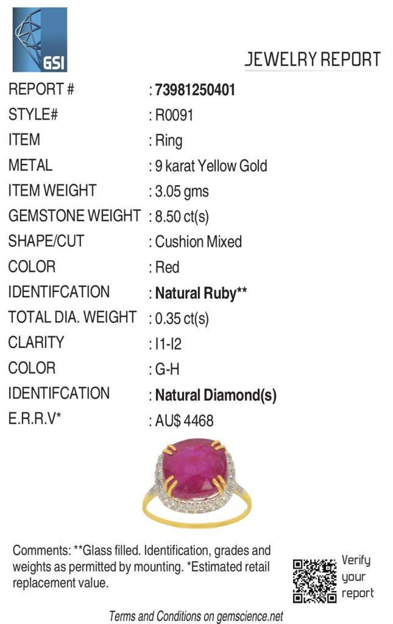 9CT YELLOW GOLD NATURAL RUBY & DIAMOND RING WITH VALUATION Weight Of The Item: 3.05 GFineness Of Metal(S): Yellow Gold 9KtThe Ring Consists Of (1) Cushion Brilliant Natural Ruby. Surrounding The Main Stones Are Round Brilliant Cut Natural Diamonds.Antique StyleIdentification: Natural RubyColor: RedShape: Cushion Brilliant CutNo. Of Stone: 1Dimension: 10 Mm X 10 Mm X 6 MmWeight: 8.5 CaratsCut: Very GoodIdentification: Natural DiamondShape: Round Brilliant CutWeight: 0.35 CtsCut: ExcellentCondition: Brand New (Unsold Jewellery Store Stock) Refer To Gemmologist Report For Further Grading Notes Accompanied By Gemmologist Report Issued By Gemological Science International (Gsi).Replacement Retail Value:$4468 Markings: 9ct Condition: Good - Refer Images 0488580+34