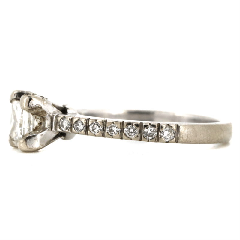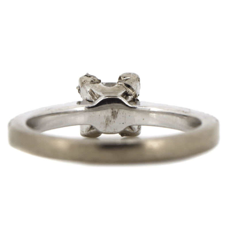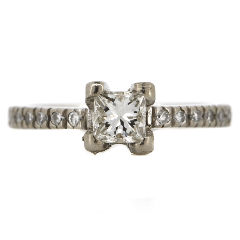 The Centre Features, One Square Princess Brilliant Cut, Diamond (0.50Ct, J Colour, Si1 Clarity), 4 Claw Basket Set. Decorating The Band Are, 14 Round Brilliant Cut, Diamonds (0.21Ct Tdw, G-H Colour, Si1-S2 Clarity), Pip-Claw Set. Ring Size J 1/2. Condition: Pre-Owned.